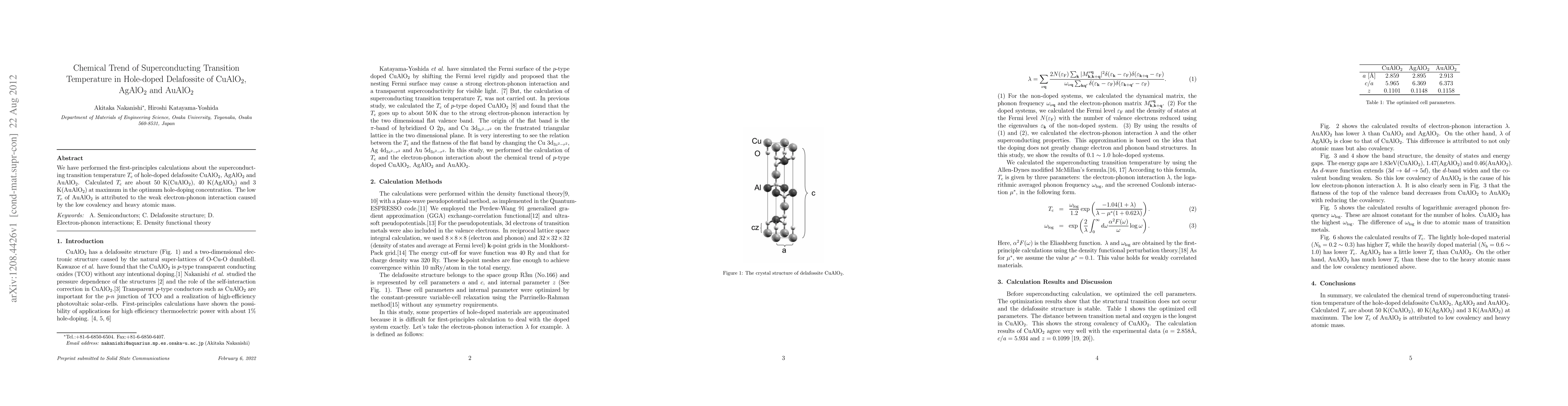 We have performed the first-principles calculations about the superconducting transition temperature T_c of hole-doped delafossite CuAlO_2, AgAlO_2 and AuAlO_2. Calculated T_c are about 50 K(CuAlO_2), 40 K(AgAlO_2) and 3 K(AuAlO_2) at maximum in the optimum hole-doping concentration. The low T_c of AuAlO_2 is attributed to the weak electron-phonon interaction caused by the low covalency and heavy atomic mass.