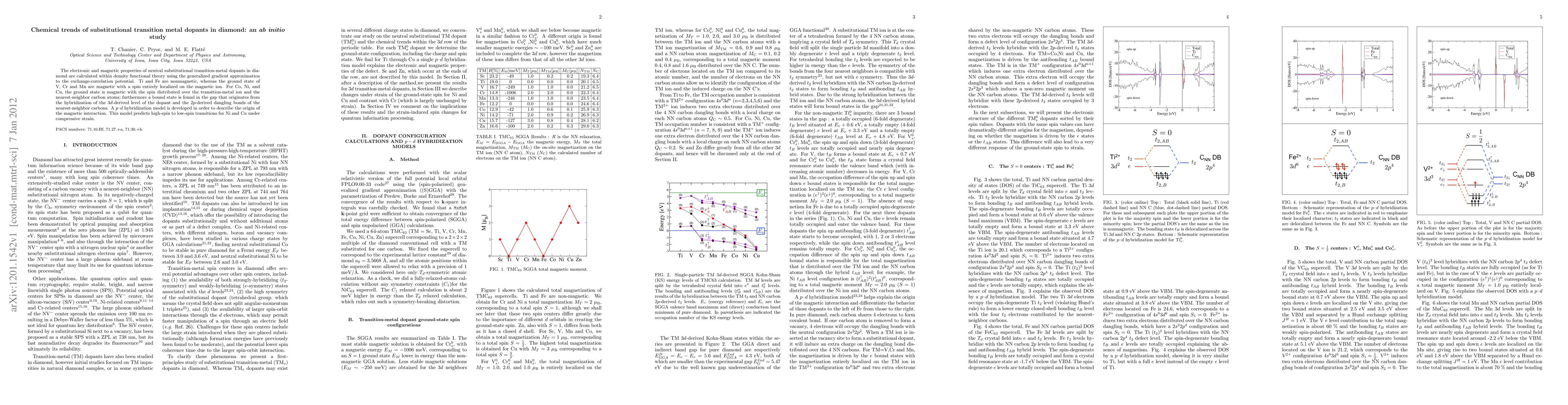 The electronic and magnetic properties of neutral substitutional transition-metal dopants in dia- mond are calculated within density functional theory using the generalized gradient approximation to the exchange-correlation potential. Ti and Fe are nonmagnetic, whereas the ground state of V, Cr and Mn are magnetic with a spin entirely localized on the magnetic ion. For Co, Ni, and Cu, the ground state is magnetic with the spin distributed over the transition-metal ion and the nearest-neighbor carbon atoms; furthermore a bound state is found in the gap that originates from the hybridization of the 3d-derived level of the dopant and the 2p-derived dangling bonds of the nearest-neighbor carbons. A p{d hybridization model is developed in order to describe the origin of the magnetic interaction. This model predicts high-spin to low-spin transitions for Ni and Cu under compressive strain.