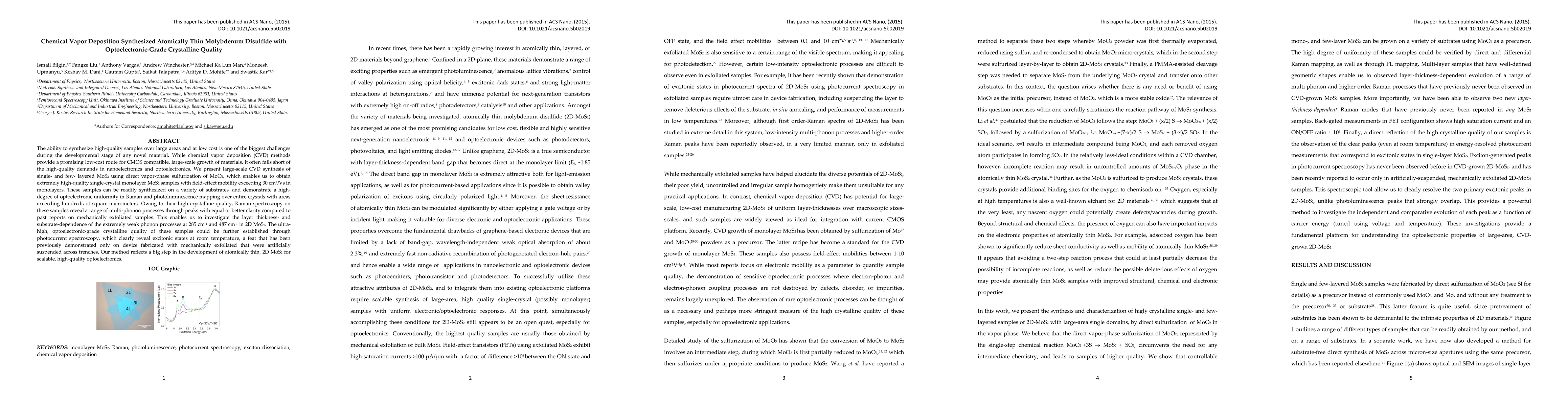 This paper presents a chemical vapor deposition method for synthesizing high-quality, large-area monolayer MoS2 with field-effect mobility exceeding 30 cm2/Vs, demonstrating optoelectronic uniformity and clarity in Raman spectroscopy. The method enables scalable production of atomically thin MoS2 suitable for advanced optoelectronic applications.