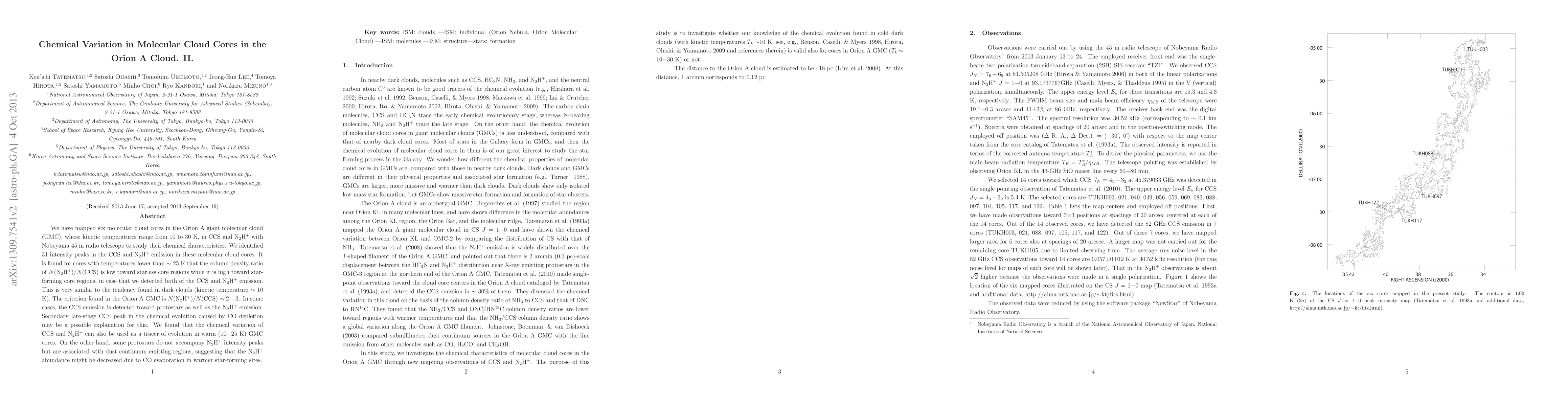 This study maps six molecular cloud cores in the Orion A GMC, revealing chemical variations in CCS and N2H+ emissions. Lower-temperature cores (<25 K) show a low N(N2H+)/N(CCS) ratio in starless regions and a high ratio in star-forming regions, similar to dark clouds. The identified criterion for evolution in warm GMC cores is N(N2H+)/N(CCS) ~ 2-3. Some protostars exhibit CCS emission alongside N2H+, suggesting secondary CCS peaks due to CO depletion.