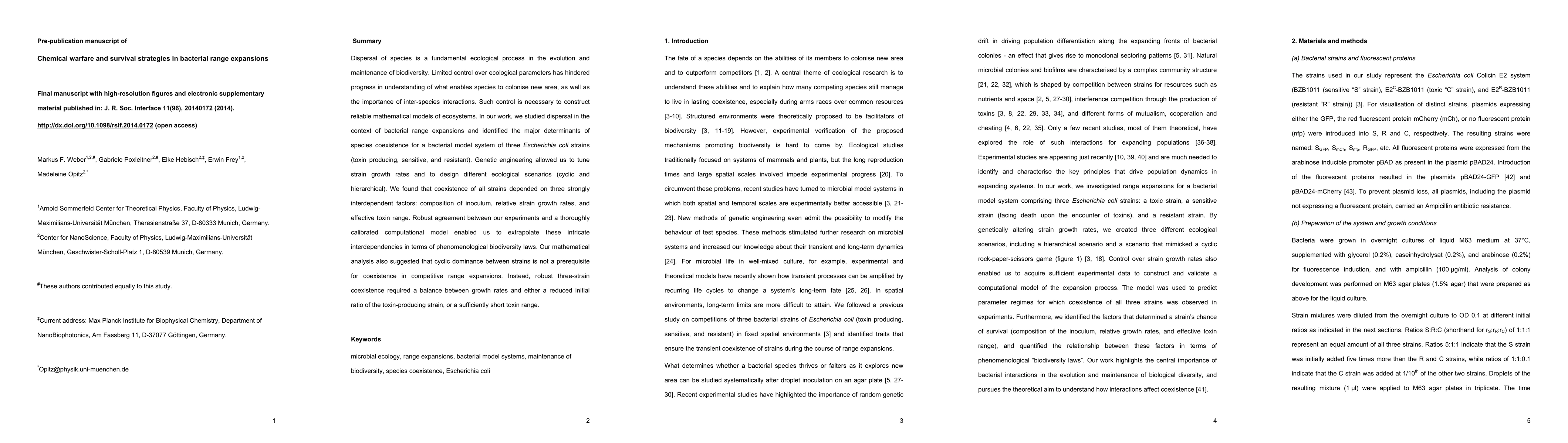 This paper investigates bacterial range expansions, focusing on the factors enabling species coexistence among three Escherichia coli strains. Through genetic engineering and controlled experiments, the study identifies that coexistence depends on inoculum composition, growth rates, and toxin range, revealing that cyclic dominance is not essential for coexistence, but a balance between growth rates and toxin range is crucial.