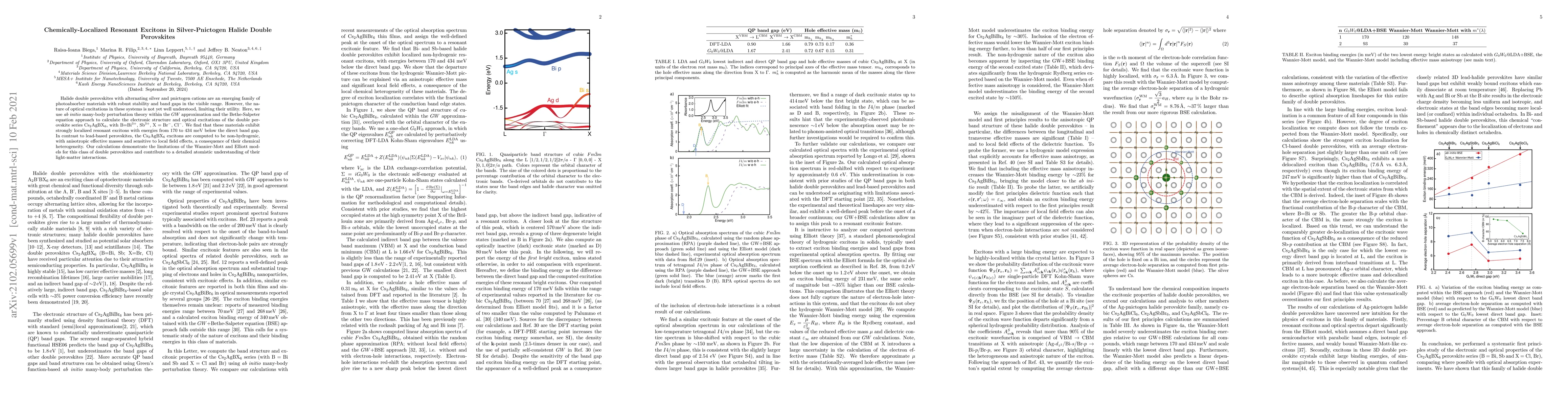 This study employs ab initio many-body perturbation theory to explore the electronic structure and optical excitations in silver-pnictogen halide double perovskites, revealing strongly localized resonant excitons. Unlike lead-based perovskites, these excitons exhibit anisotropic effective masses and sensitivity to local field effects due to chemical heterogeneity, challenging existing theoretical models.