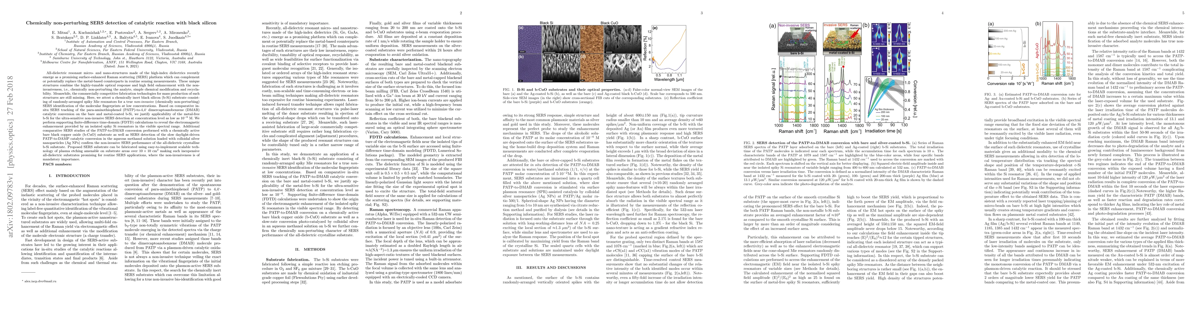 All-dielectric resonant micro- and nano-structures made of the high-index dielectrics recently emerge as a promising SERS platform which can complement or potentially replace the metal-based counterparts in routine sensing measurements. These unique structures combine the highly-tunable optical response and high field enhancement with the non-invasiveness, i.e., chemically non-perturbing the analyte, simple chemical modification and recyclability. Meanwhile, the commercially competitive fabrication technologies for mass production of such structures are still missing. Here, we attest a chemically inert black silicon (b-Si) substrate consisting of randomly-arranged spiky Mie resonators for a true non-invasive SERS identification of the molecular fingerprints at low concentrations. Based on comparative in-situ SERS tracking of the para-aminothiophenol -to-4,4` dimercaptoazobenzene catalytic conversion on the bare and metal-coated b-Si, we justify applicability of the metal-free b-Si for the ultra-sensitive non-invasive SERS detection at concentration level as low as 10^-6 M. We perform finite-difference time-domain calculations to reveal the electromagnetic enhancement provided by an isolated spiky Si resonator in the visible spectral range. Additional comparative SERS studies of the PATP-to-DMAB conversion performed with a chemically active bare black copper oxide as well as SERS detection of the slow daylight-driven PATP-to-DAMP catalytic conversion in the aqueous methanol solution loaded with colloidal silver nanoparticles confirm the non-invasive SERS performance of the all-dielectric crystalline b-Si substrate. Proposed SERS substrate can be fabricated using simple scalable technology of plasma etching amenable on large substrate areas making such inexpensive all-dielectric substrates promising for routine SERS applications, where the non-invasiveness is of mandatory importance.