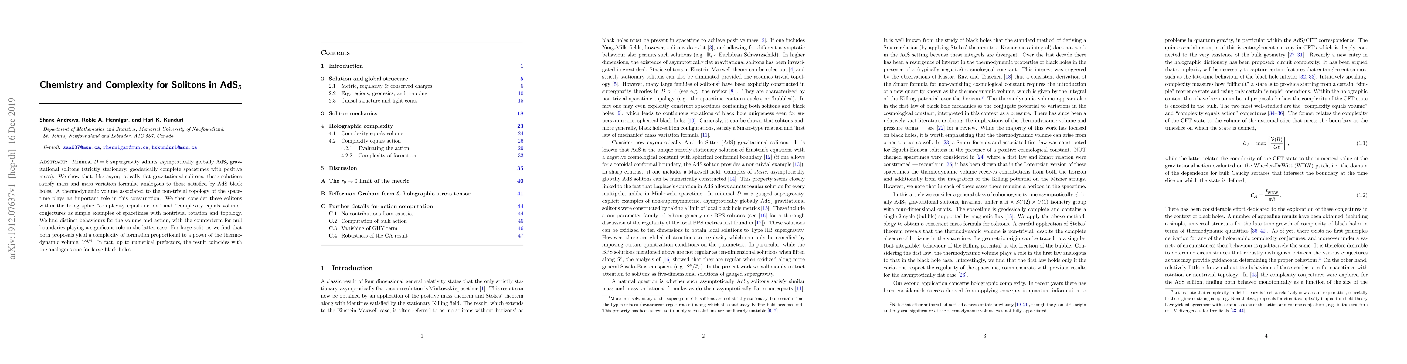 Minimal $D=5$ supergravity admits asymptotically globally AdS$_5$ gravitational solitons (strictly stationary, geodesically complete spacetimes with positive mass). We show that, like asymptotically flat gravitational solitons, these solutions satisfy mass and mass variation formulas analogous to those satisfied by AdS black holes. A thermodynamic volume associated to the non-trivial topology of the spacetime plays an important role in this construction. We then consider these solitons within the holographic ``complexity equals action'' and ``complexity equals volume'' conjectures as simple examples of spacetimes with nontrivial rotation and topology. We find distinct behaviours for the volume and action, with the counterterm for null boundaries playing a significant role in the latter case. For large solitons we find that both proposals yield a complexity of formation proportional to a power of the thermodynamic volume, $V^{3/4}$. In fact, up to numerical prefactors, the result coincides with the analogous one for large black holes.