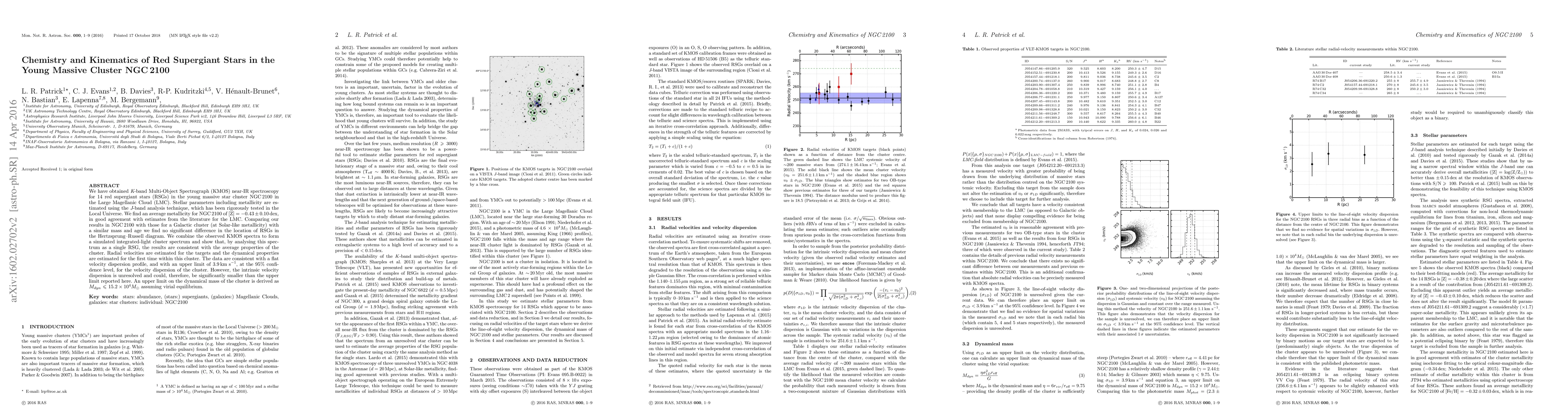 We have obtained K-band Multi-Object Spectrograph (KMOS) near-IR spectroscopy for 14 red supergiant stars (RSGs) in the young massive star cluster NGC 2100 in the Large Magellanic Cloud (LMC). Stellar parameters including metallicity are estimated using the J-band analysis technique, which has been rigorously tested in the Local Universe. We find an average metallicity for NGC 2100 of [Z]=$-$0.43$\pm$0.10 dex, in good agreement with estimates from the literature for the LMC. Comparing our results in NGC 2100 with those for a Galactic cluster (at Solar-like metallicity) with a similar mass and age we find no significant difference in the location of RSGs in the Hertzsprung--Russell diagram. We combine the observed KMOS spectra to form a simulated integrated-light cluster spectrum and show that, by analysing this spectrum as a single RSG, the results are consistent with the average properties of the cluster. Radial velocities are estimated for the targets and the dynamical properties are estimated for the first time within this cluster. The data are consistent with a flat velocity dispersion profile, and with an upper limit of 3.9 km/s, at the 95% confidence level, for the velocity dispersion of the cluster. However, the intrinsic velocity dispersion is unresolved and could, therefore, be significantly smaller than the upper limit reported here. An upper limit on the dynamical mass of the cluster is derived as $M_{dyn}$ $\le$ $15.2\times10^{4}M_{\odot}$ assuming virial equilibrium.