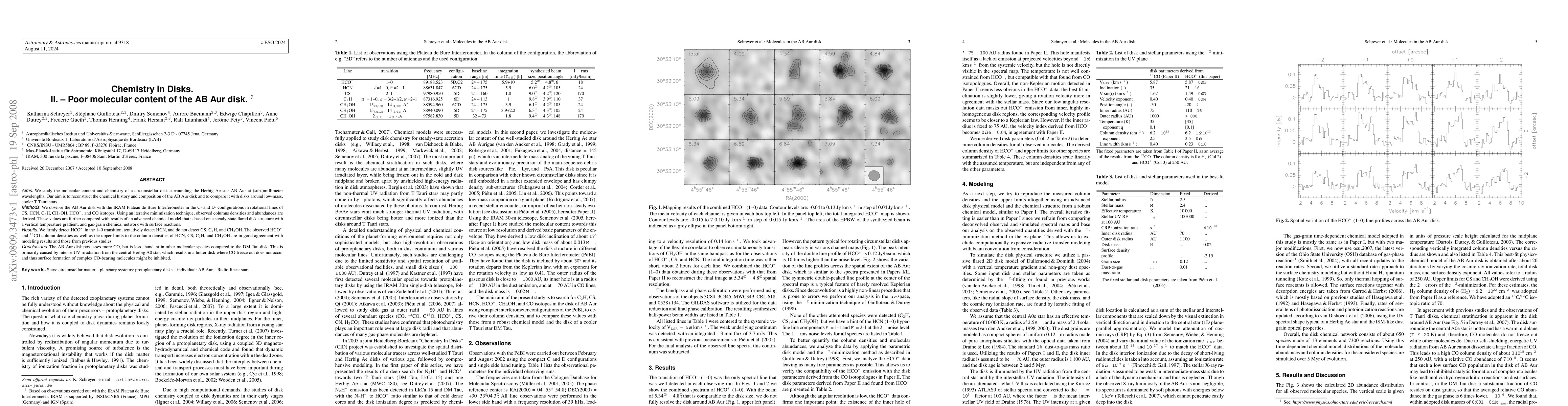 We study the molecular content and chemistry of a circumstellar disk surrounding the Herbig Ae star AB Aur at (sub-)millimeter wavelengths. Our aim is to reconstruct the chemical history and composition of the AB Aur disk and to compare it with disks around low-mass, cooler T Tauri stars. We observe the AB Aur disk with the IRAM Plateau de Bure Interferometer in the C- and D- configurations in rotational lines of CS, HCN, C2H, CH3OH, HCO+, and CO isotopes. Using an iterative minimization technique, observed columns densities and abundances are derived. These values are further compared with results of an advanced chemical model that is based on a steady-state flared disk structure with a vertical temperature gradient, and gas-grain chemical network with surface reactions. We firmly detect HCO+ in the 1--0 transition, tentatively detect HCN, and do not detect CS, C2H, and CH3OH. The observed HCO+ and 13CO column densities as well as the upper limits to the column densities of HCN, CS, C2H, and CH3OH are in good agreement with modeling results and those from previous studies. The AB Aur disk possesses more CO, but is less abundant in other molecular species compared to the DM Tau disk. This is primarily caused by intense UV irradiation from the central Herbig A0 star, which results in a hotter disk where CO freeze out does not occur and thus surface formation of complex CO-bearing molecules might be inhibited.