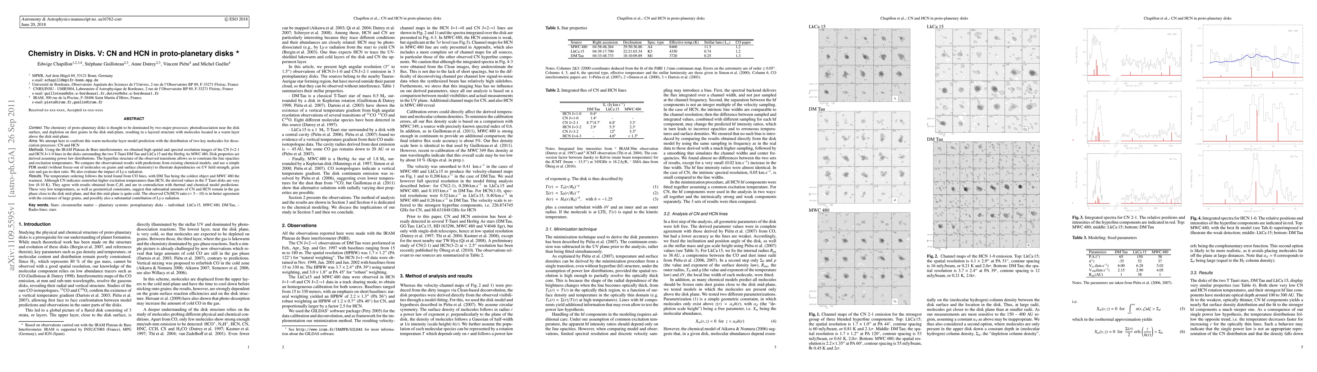 The chemistry of proto-planetary disks is thought to be dominated by two major processes: photodissociation near the disk surface, and depletion on dust grains in the disk mid-plane, resulting in a layered structure with molecules located in a warm layer above the disk mid-plane. We attempt here to confront this warm molecular layer model prediction with the distribution of two key molecules for dissociation processes: CN and HCN. Using the IRAM Plateau de Bure interferometer, we obtained high spatial and spectral resolution images of the CN J=2-1 and HCN J=1-0 lines in the disks surrounding the two T-Tauri DM Tau and LkCa 15 and the Herbig Ae MWC 480. Disk properties are derived assuming power law distributions. The hyperfine structure of the observed transitions allows us to constrain the line opacities and excitation temperatures. We compare the observational results with predictions from existing chemical models, and use a simple PDR model (without freeze-out of molecules on grains and surface chemistry) to illustrate dependencies on UV field strength, grain size and gas-to-dust ratio. We also evaluate the impact of Lyman alpha radiation. The temperature ordering follows the trend found from CO lines, with DM Tau being the coldest object and MWC 480 the warmest. Although CN indicates somewhat higher excitation temperatures than HCN, the derived values in the T-Tauri disks are very low (8-10 K). They agree with results obtained from CCH, and are in contradiction with thermal and chemical model predictions. These very low temperatures, as well as geometrical constraints, suggest that substantial amounts of CN and HCN remain in the gas phase close to the disk mid-plane, and that this mid-plane is quite cold. The observed CN/HCN ratio (5-10) is in better agreement with the existence of large grains, and possibly also a substantial contribution of Lyman alpha radiation.