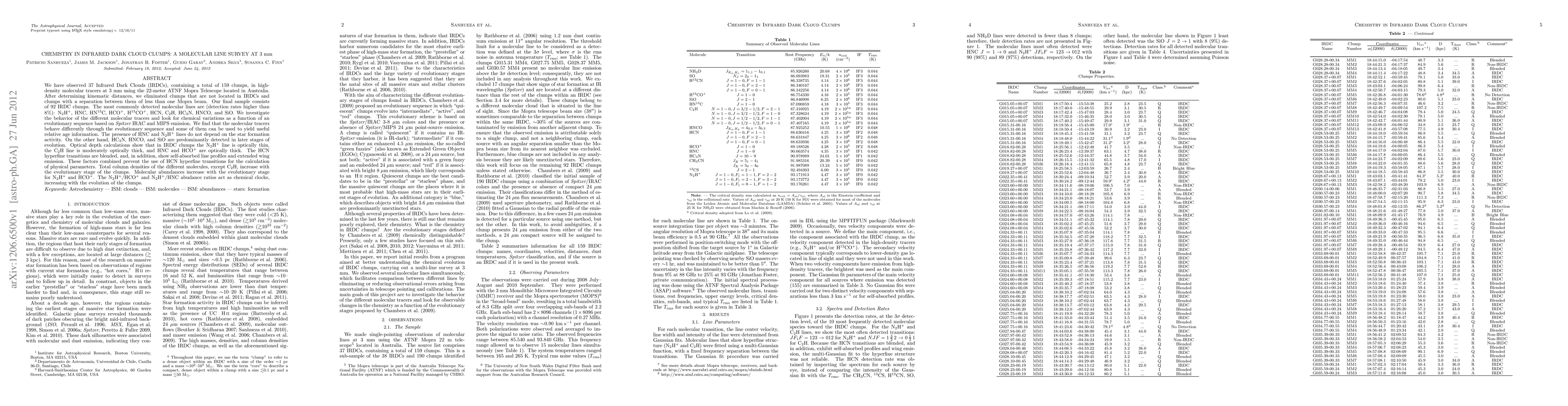 This study uses the Mopra Telescope to survey 92 Infrared Dark Cloud clumps, detecting molecular lines like N2H+, HNC, and HCN. The research finds that molecular tracers vary with evolutionary stages, with some, like HNC and N2H+, unaffected by star formation activity, while others like HC3N and HNCO are more prominent in later stages. The N2H+ line is optically thin, aiding in chemical clock calculations.