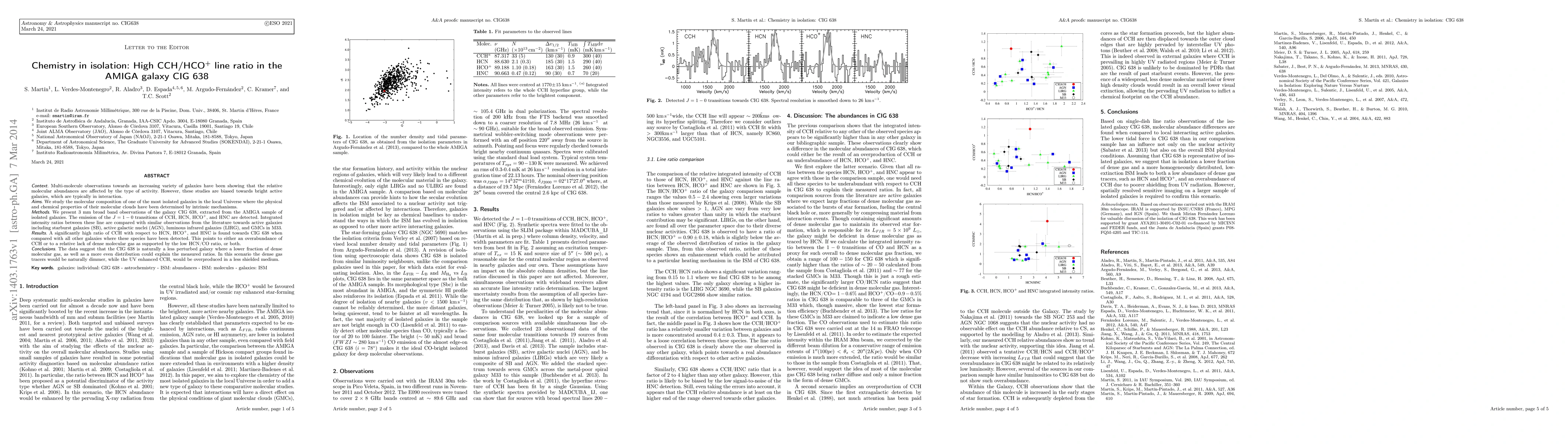 Multi-molecule observations towards an increasing variety of galaxies have been showing that the relative molecular abundances are affected by the type of activity. However, these studies are biased towards bright active galaxies, which are typically in interaction. We study the molecular composition of one of the most isolated galaxies in the local Universe where the physical and chemical properties of their molecular clouds have been determined by intrinsic mechanisms. We present 3 mm broad band observations of the galaxy CIG 638, extracted from the AMIGA sample of isolated galaxies. The emission of the J=1-0 transitions of CCH, HCN, HCO+, and HNC are detected. Integrated intensity ratios between these line are compared with similar observations from the literature towards active galaxies including starburst galaxies (SB), active galactic nuclei (AGN), luminous infrared galaxies (LIRG), and GMCs in M33. A significantly high ratio of CCH with respect to HCN, HCO+, and HNC is found towards CIG 638 when compared with all other galaxies where these species have been detected. This points to either an overabundance of CCH or to a relative lack of dense molecular gas as supported by the low HCN/CO ratio, or both. The data suggest that the CIG 638 is naturally a less perturbed galaxy where a lower fraction of dense molecular gas, as well as a more even distribution could explain the measured ratios. In this scenario the dense gas tracers would be naturally dimmer, while the UV enhanced CCH, would be overproduced in a less shielded medium.