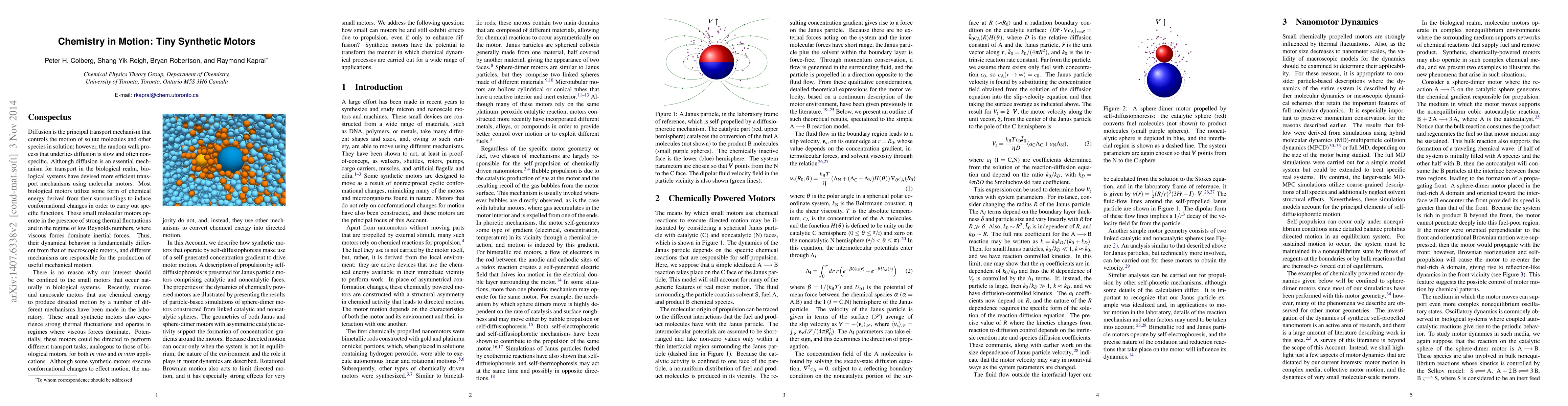 This paper explores synthetic motors driven by self-diffusiophoresis, detailing the mechanisms behind their motion using concentration gradients. It discusses Janus and sphere-dimer motors, emphasizing the role of asymmetric catalytic activity and the impact of non-equilibrium conditions and Brownian motion on their functionality.