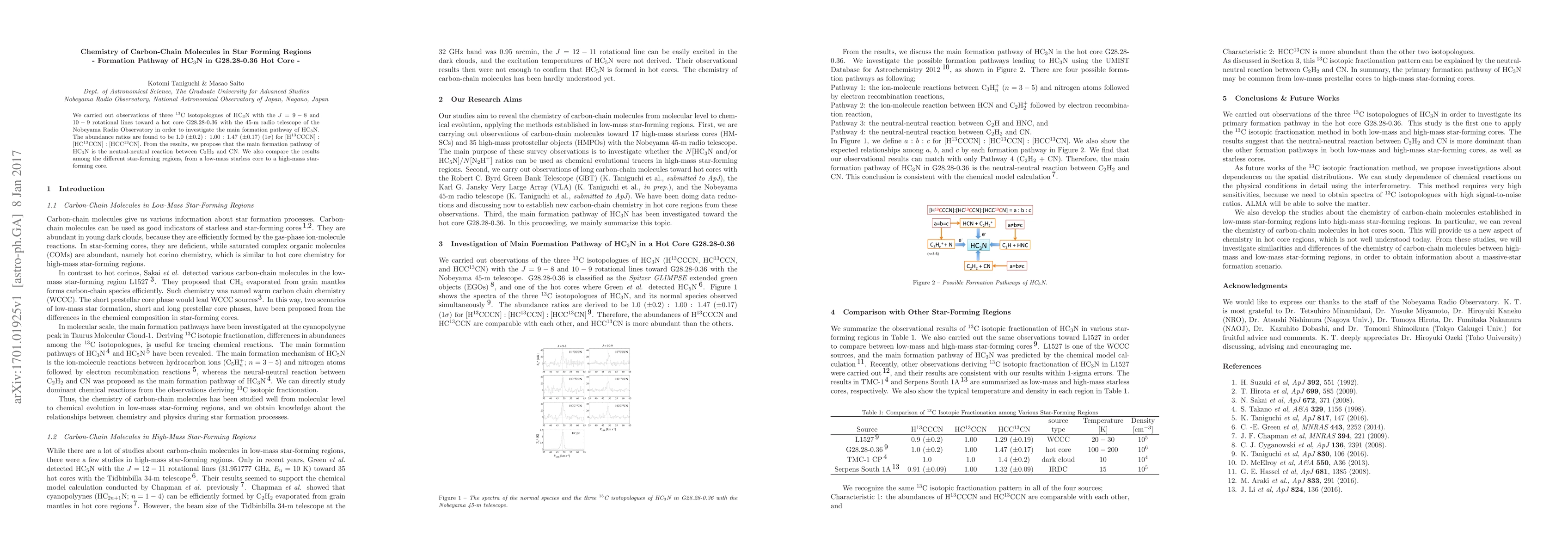 We aim to reveal the chemistry of carbon-chain molecules in high-mass star-forming regions from molecular level to chemical evolution, applying the methods established in low-mass star-forming regions. In this proceeding, we summarize the topic about the main formation pathway of HC3N. We carried out observations of three 13C isotopologues of HC3N toward a hot core G28.28-0.36 with the 45-m radio telescope of the Nobeyama Radio Observatory. From the observational results, we propose that the main formation pathway of HC3N is the neutral-neutral reaction between C2H2 and CN. We also compare the results among the different star-forming regions, from a low-mass starless core to a high-mass star-forming core.