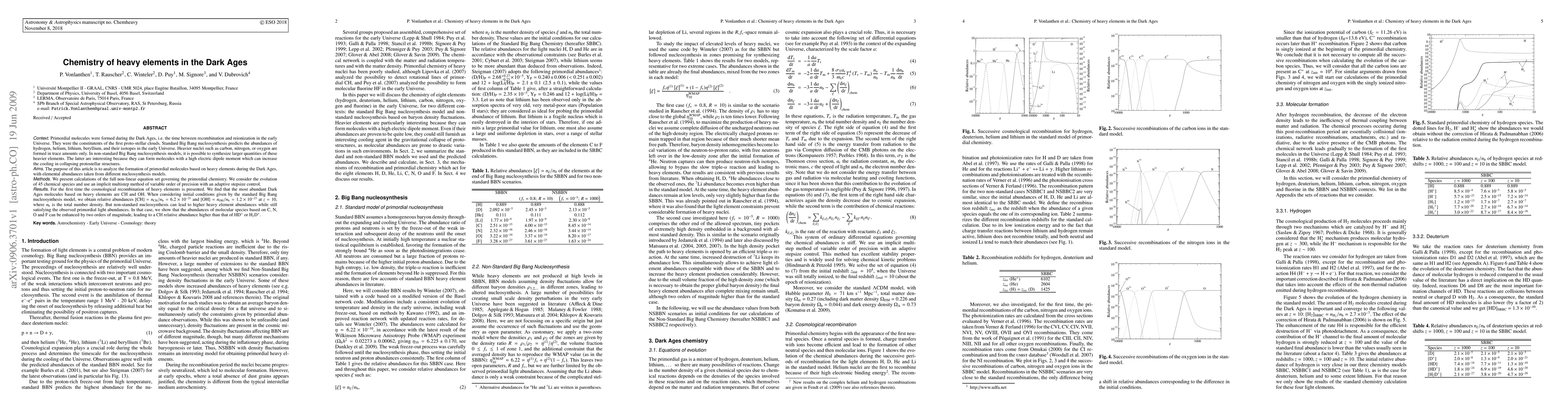 Primordial molecules were formed during the Dark Ages, i.e. the time between recombination and reionization in the early Universe. The purpose of this article is to analyze the formation of primordial molecules based on heavy elements during the Dark Ages, with elemental abundances taken from different nucleosynthesis models. We present calculations of the full non-linear equation set governing the primordial chemistry. We consider the evolution of 45 chemical species and use an implicit multistep method of variable order of precision with an adaptive stepsize control. We find that the most abundant Dark Ages molecules based on heavy elements are CH and OH. Non-standard nucleosynthesis can lead to higher heavy element abundances while still satisfying the observed primordial light abundances. In that case, we show that the abundances of molecular species based on C, N, O and F can be enhanced by two orders of magnitude compared to the standard case, leading to a CH relative abundance higher than that of HD+ or H2D+.