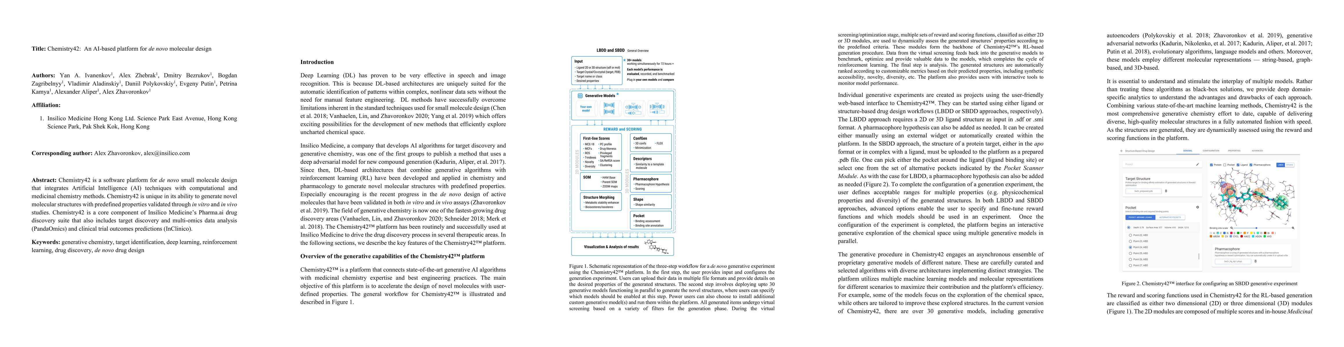 Chemistry42 is a software platform for de novo small molecule design that integrates Artificial Intelligence (AI) techniques with computational and medicinal chemistry methods. Chemistry42 is unique in its ability to generate novel molecular structures with predefined properties validated through in vitro and in vivo studies. Chemistry42 is a core component of Insilico Medicine Pharma.ai drug discovery suite that also includes target discovery and multi-omics data analysis (PandaOmics) and clinical trial outcomes predictions (InClinico).