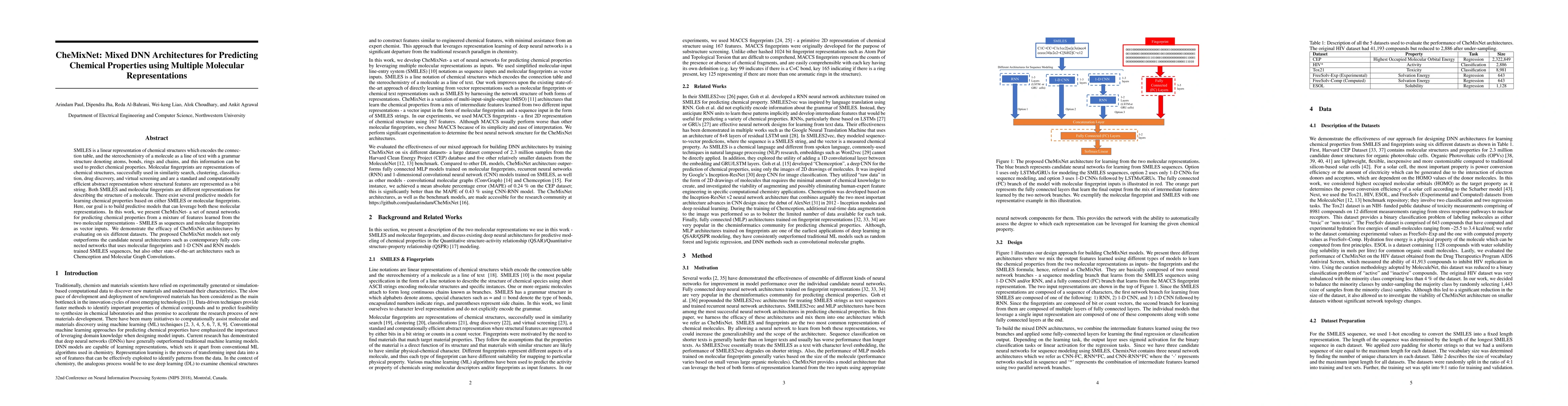 SMILES is a linear representation of chemical structures which encodes the connection table, and the stereochemistry of a molecule as a line of text with a grammar structure denoting atoms, bonds, rings and chains, and this information can be used to predict chemical properties. Molecular fingerprints are representations of chemical structures, successfully used in similarity search, clustering, classification, drug discovery, and virtual screening and are a standard and computationally efficient abstract representation where structural features are represented as a bit string. Both SMILES and molecular fingerprints are different representations for describing the structure of a molecule. There exist several predictive models for learning chemical properties based on either SMILES or molecular fingerprints. Here, our goal is to build predictive models that can leverage both these molecular representations. In this work, we present CheMixNet -- a set of neural networks for predicting chemical properties from a mixture of features learned from the two molecular representations -- SMILES as sequences and molecular fingerprints as vector inputs. We demonstrate the efficacy of CheMixNet architectures by evaluating on six different datasets. The proposed CheMixNet models not only outperforms the candidate neural architectures such as contemporary fully connected networks that uses molecular fingerprints and 1-D CNN and RNN models trained SMILES sequences, but also other state-of-the-art architectures such as Chemception and Molecular Graph Convolutions.