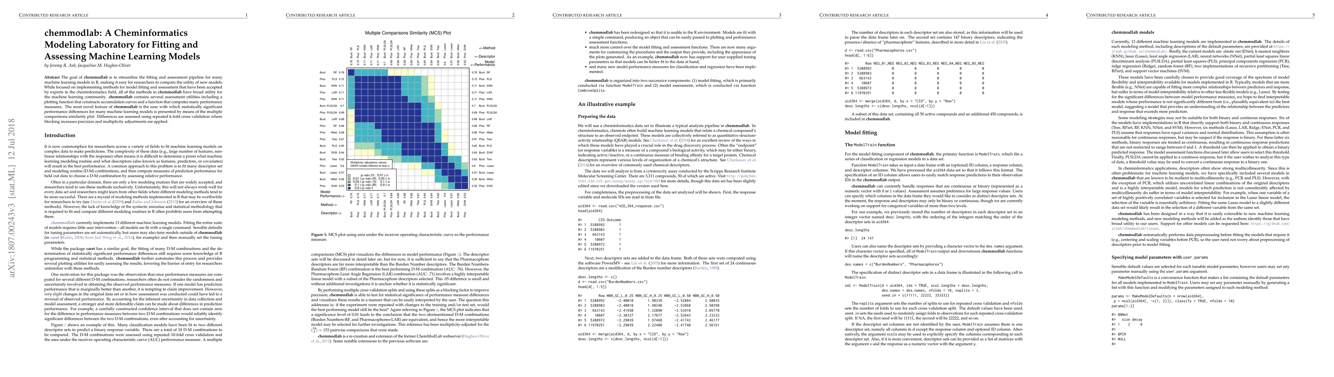 The goal of chemmodlab is to streamline the fitting and assessment pipeline for many machine learning models in R, making it easy for researchers to compare the utility of new models. While focused on implementing methods for model fitting and assessment that have been accepted by experts in the cheminformatics field, all of the methods in chemmodlab have broad utility for the machine learning community. chemmodlab contains several assessment utilities including a plotting function that constructs accumulation curves and a function that computes many performance measures. The most novel feature of chemmodlab is the ease with which statistically significant performance differences for many machine learning models is presented by means of the multiple comparisons similarity plot. Differences are assessed using repeated k-fold cross validation where blocking increases precision and multiplicity adjustments are applied.