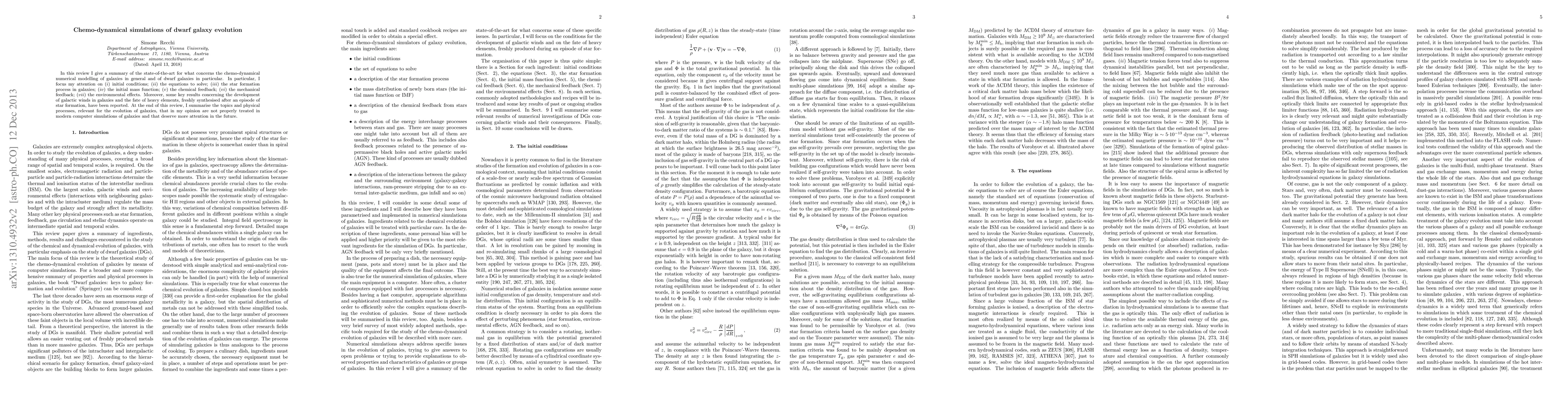 This review summarizes the state-of-the-art in chemo-dynamical numerical modeling of galaxies, with a focus on dwarf galaxies. It covers initial conditions, equations to solve, star formation processes, initial mass function, chemical and mechanical feedback, and environmental effects.