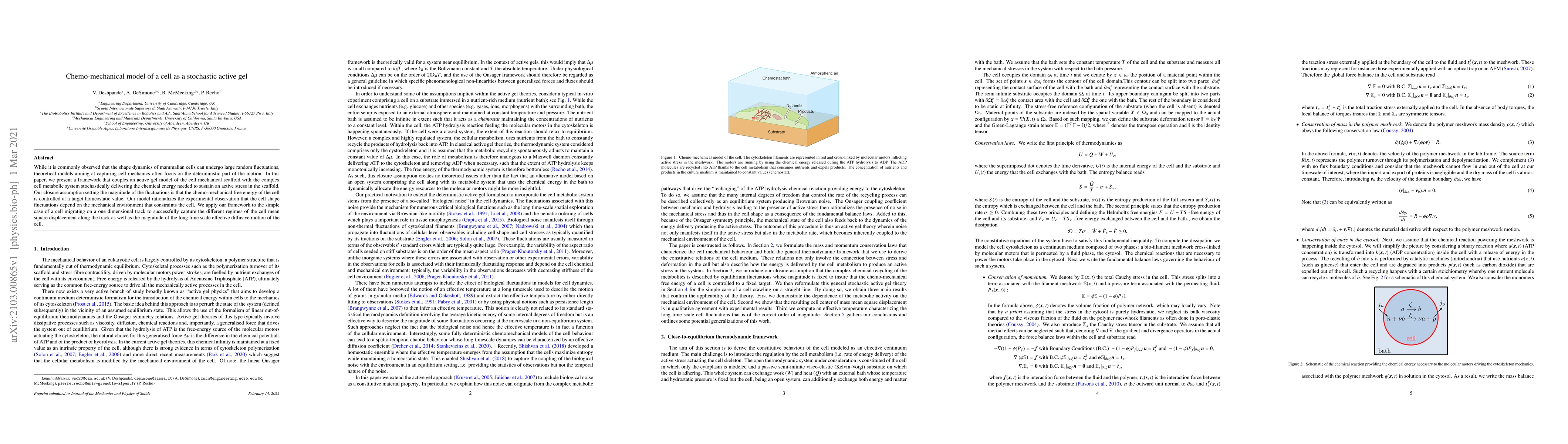 While it is commonly observed that the shape dynamics of mammalian cells can undergo large random fluctuations, theoretical models aiming at capturing cell mechanics often focus on the deterministic part of the motion. In this paper, we present a framework that couples an active gel model of the cell mechanical scaffold with the complex cell metabolic system stochastically delivering the chemical energy needed to sustain an active stress in the scaffold. Our closure assumption setting the magnitude of the fluctuations is that the chemo-mechanical free energy of the cell is controlled at a target homeostatic value. Our model rationalizes the experimental observation that the cell shape fluctuations depend on the mechanical environment that constraints the cell. We apply our framework to the simple case of a cell migrating on a one dimensional track to successfully capture the different regimes of the cell mean square displacement along the track as well as the magnitude of the long time scale effective diffusive motion of the cell.