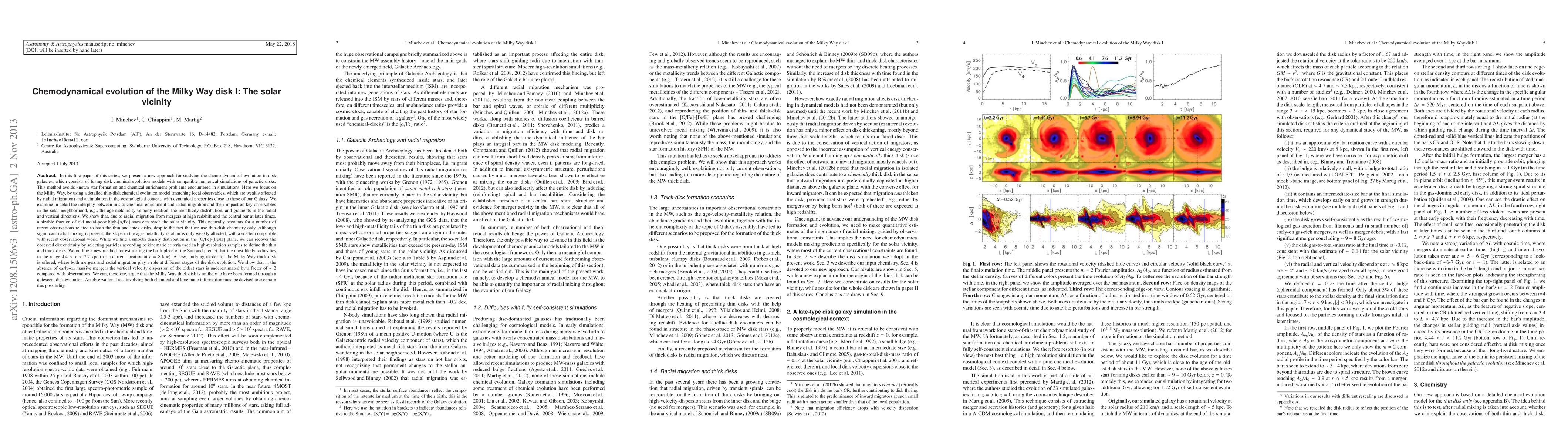 This paper introduces a novel chemo-dynamical model for the Milky Way's disk evolution, combining chemical evolution models with cosmological simulations. It finds that radial migration and mergers explain the presence of old metal-poor stars in the solar vicinity, offering a unifying model for the Milky Way's thick disk and suggesting the Sun likely formed between 4.4 and 7.7 kpc.