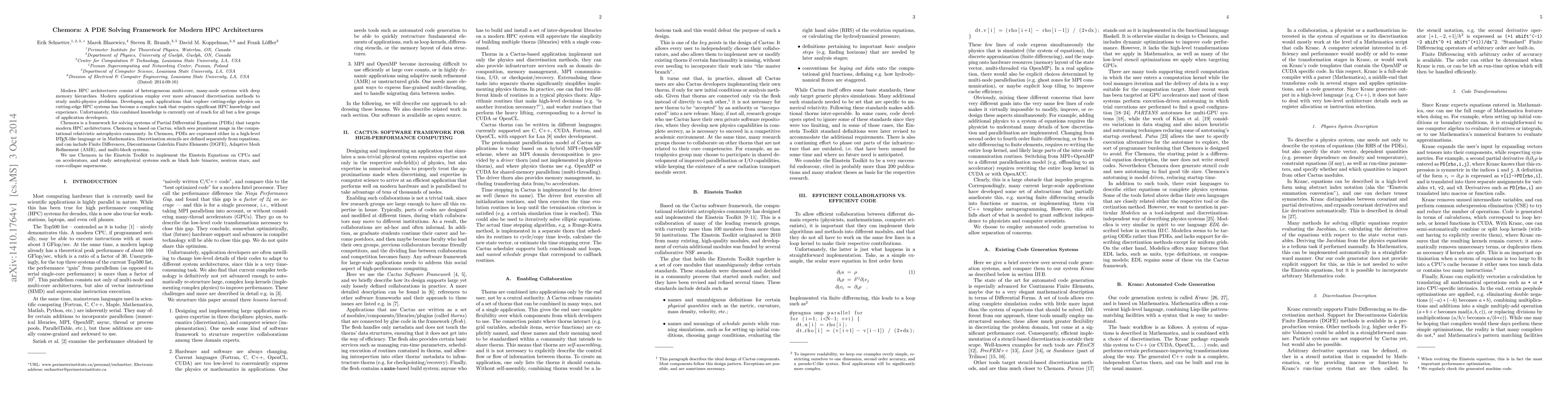 The research presents Chemora, a framework for solving systems of Partial Differential Equations (PDEs) on modern HPC architectures, built on Cactus. PDEs are expressed in a high-level LaTeX-like language or Mathematica, with discretization stencils defined separately, supporting methods like Finite Differences, Discontinuous Galerkin Finite Elements (DGFE), Adaptive Mesh Refinement (AMR), and multi-block systems.