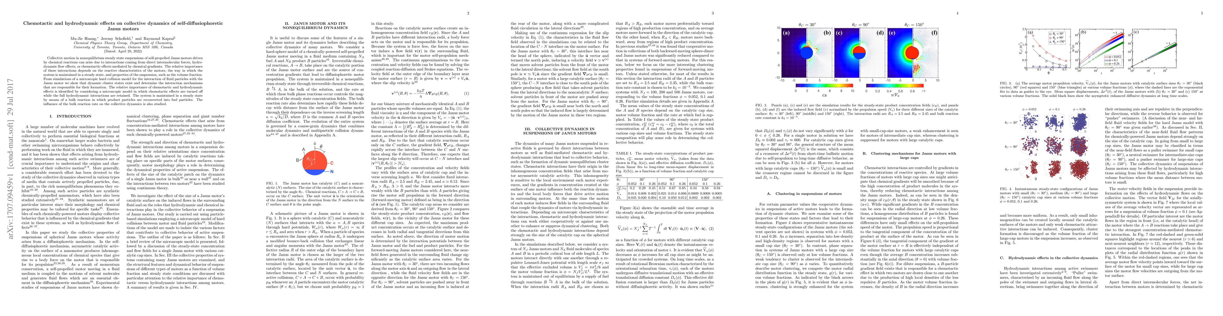 This paper investigates the collective dynamics of self-diffusiophoretic Janus motors in nonequilibrium steady states, focusing on the interplay between chemotactic, hydrodynamic, and intermolecular forces. Simulations reveal dynamic cluster states and identify the dominant interaction mechanisms, with a particular emphasis on the effects of chemotactic and hydrodynamic interactions.