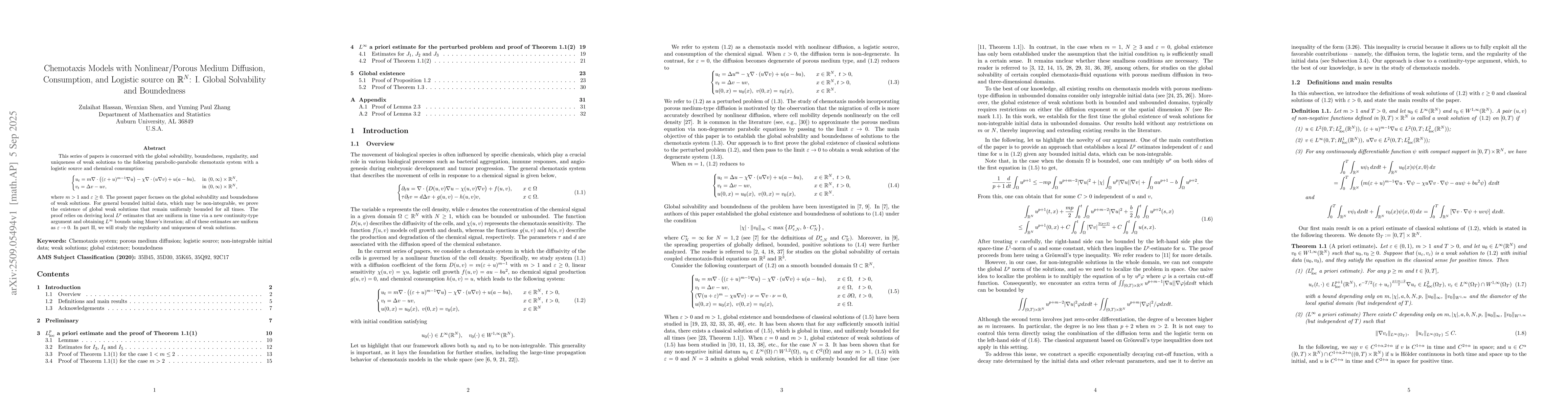 This series of papers is concerned with the global solvability, boundedness, regularity, and uniqueness of weak solutions to the following parabolic-parabolic chemotaxis system with a logistic source and chemical consumption: \begin{equation*} \begin{cases} u_t = m\nabla\cdot \left((\eps+u)^{m-1}\nabla u\right) - \chi \nabla \cdot (u \nabla v) + u(a - b u), & \text{ in } (0,\infty)\times\mathbb{R}^N, \\ v_t = \Delta v - uv, & \text{ in } (0,\infty)\times\mathbb{R}^N, \end{cases} \end{equation*} where $m > 1$ and $\eps \geq 0$. The present paper focuses on the global solvability and boundedness of weak solutions. For general bounded initial data, which may be non-integrable, we prove the existence of global weak solutions that remain uniformly bounded for all times. The proof relies on deriving local $L^p$ estimates that are uniform in time via a new continuity-type argument and obtaining $L^\infty$ bounds using Moser's iteration; all of these estimates are uniform as $\eps\to0$. In part II, we will study the regularity and uniqueness of weak solutions.