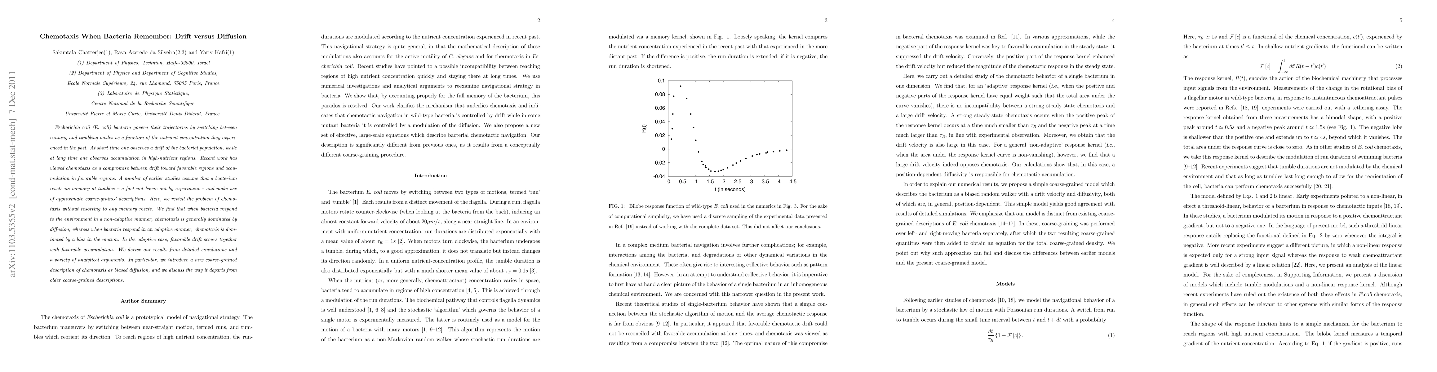 This paper investigates how {\sl E. coli} bacteria navigate their environment through chemotaxis, finding that non-adaptive responses lead to diffusion-dominated behavior, while adaptive responses result in drift and accumulation in nutrient-rich areas. The study rejects memory resets at tumbles and introduces a new coarse-grained model of biased diffusion.