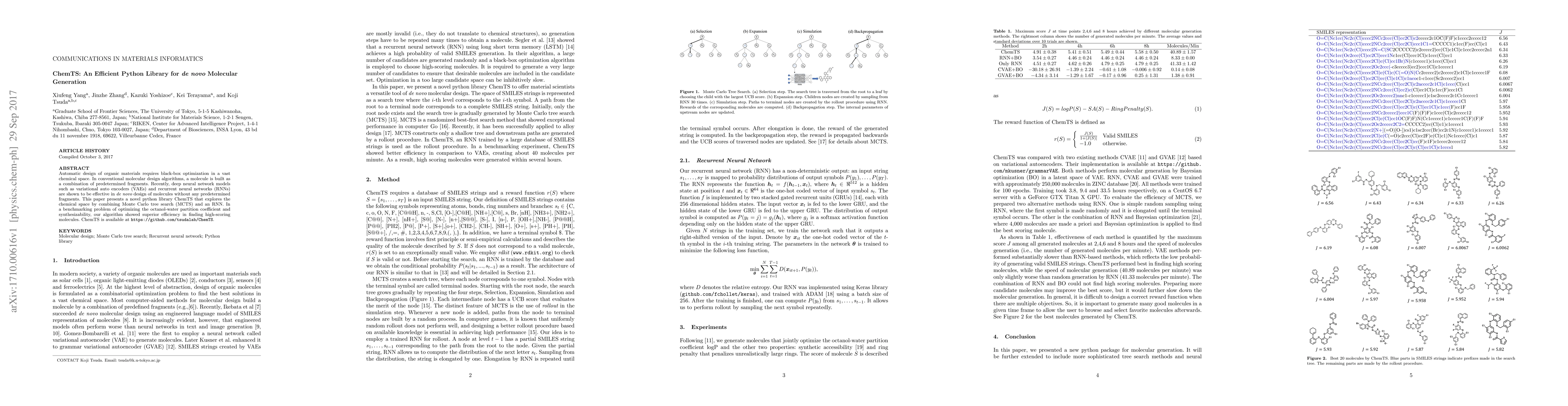 ChemTS is a Python library that employs Monte Carlo tree search and recurrent neural networks for efficient de novo molecular generation, outperforming conventional methods in optimizing properties like octanol-water partition coefficient and synthesizability. It is available for use at [GitHub](https://github.com/tsudalab/ChemTS).