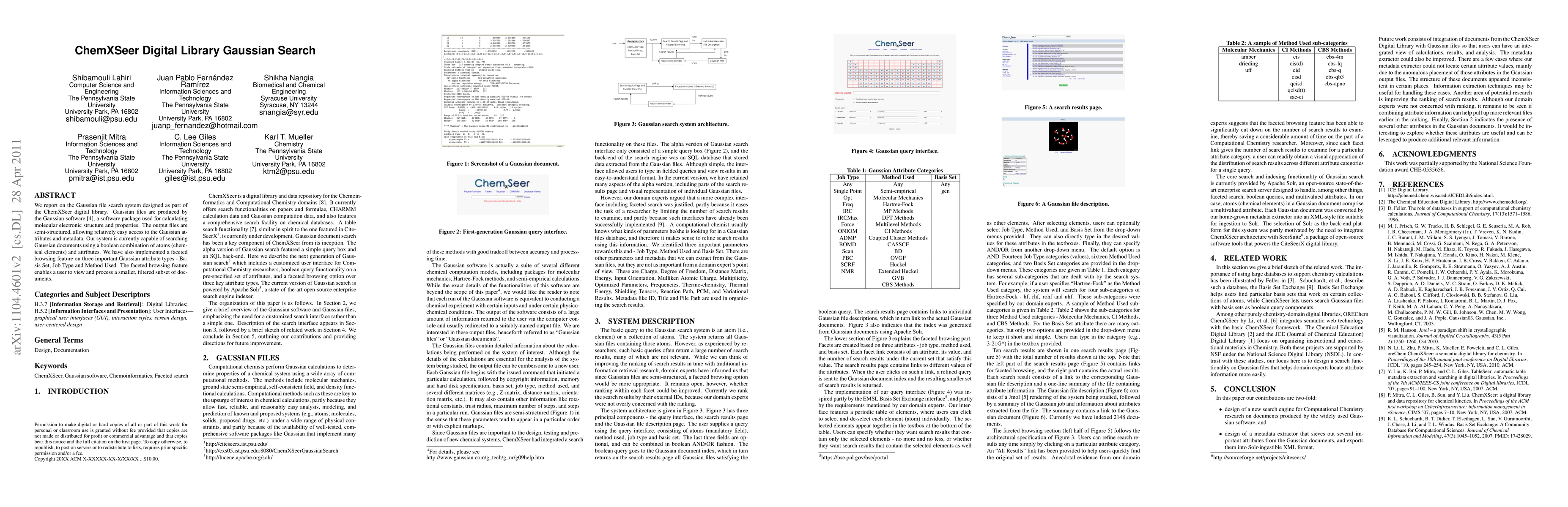 The ChemXSeer digital library introduces a Gaussian file search system for accessing molecular electronic structure data, allowing boolean searches by atoms and attributes, and featuring faceted browsing for Basis Set, Job Type, and Method Used. This system enhances the filtering and retrieval of semi-structured Gaussian output files.