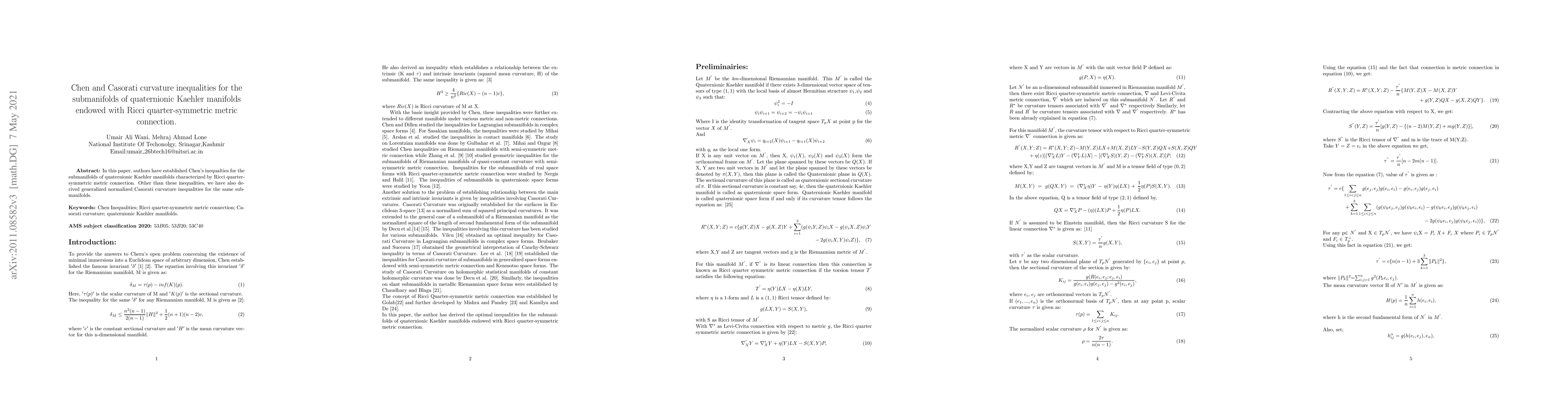 Summary: This paper establishes Chen's inequalities and generalized normalized Casorati curvature inequalities for submanifolds within quaternionic Kähler manifolds equipped with a Ricci quarter-symmetric metric connection. These results extend existing geometric inequalities to this specific geometric setting.
