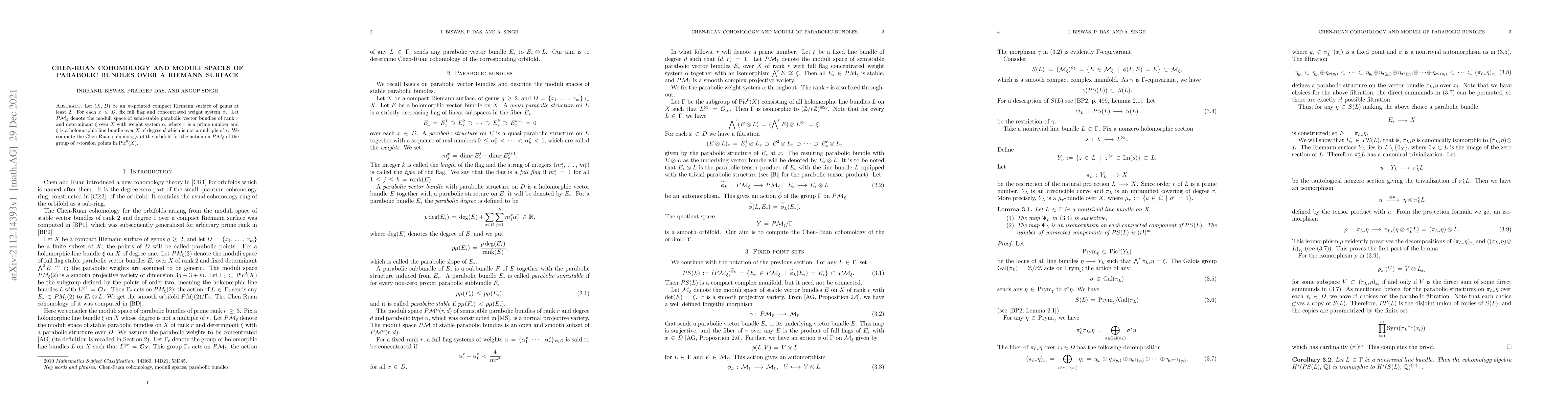 This paper computes the Chen-Ruan cohomology of the moduli space of semi-stable parabolic vector bundles over an $m$-pointed Riemann surface with fixed weight systems, under the action of $r$-torsion points in ${\rm Pic}^0(X)$. It focuses on cases where the rank $r$ is a prime number.