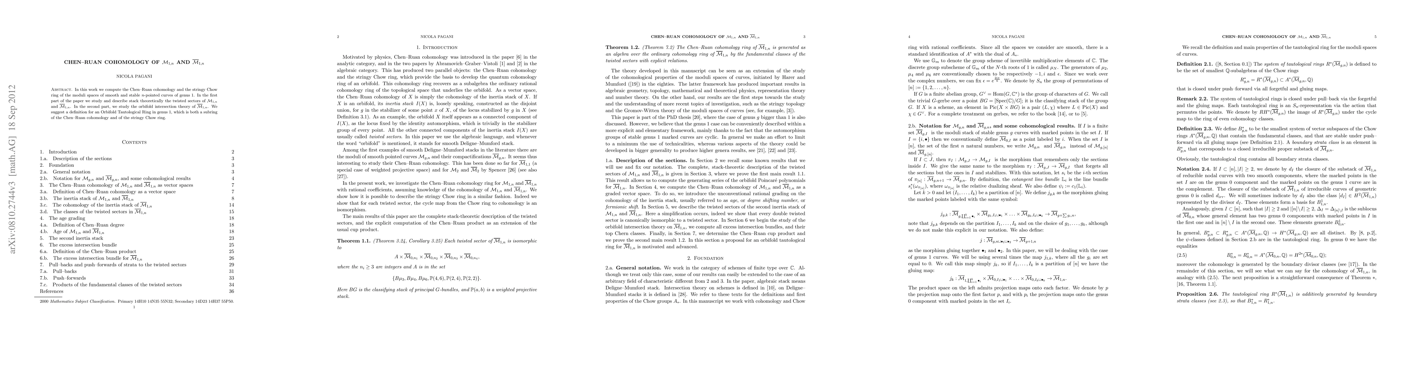 In this work we compute the Chen--Ruan cohomology and the stringy Chow ring of the moduli spaces of smooth and stable $n$-pointed curves of genus 1. We suggest a definition for an Orbifold Tautological Ring in genus 1, which is both a subring of the Chen--Ruan cohomology and of the stringy Chow ring.