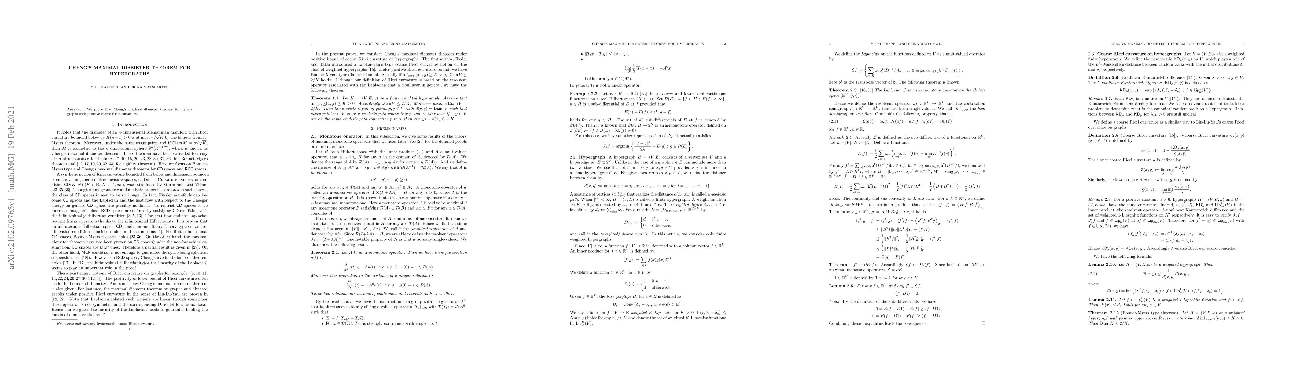 Summary: This paper proves Cheng's maximal diameter theorem for hypergraphs under the condition of positive coarse Ricci curvature, establishing a relationship between geometric properties and the diameter of hypergraphs.