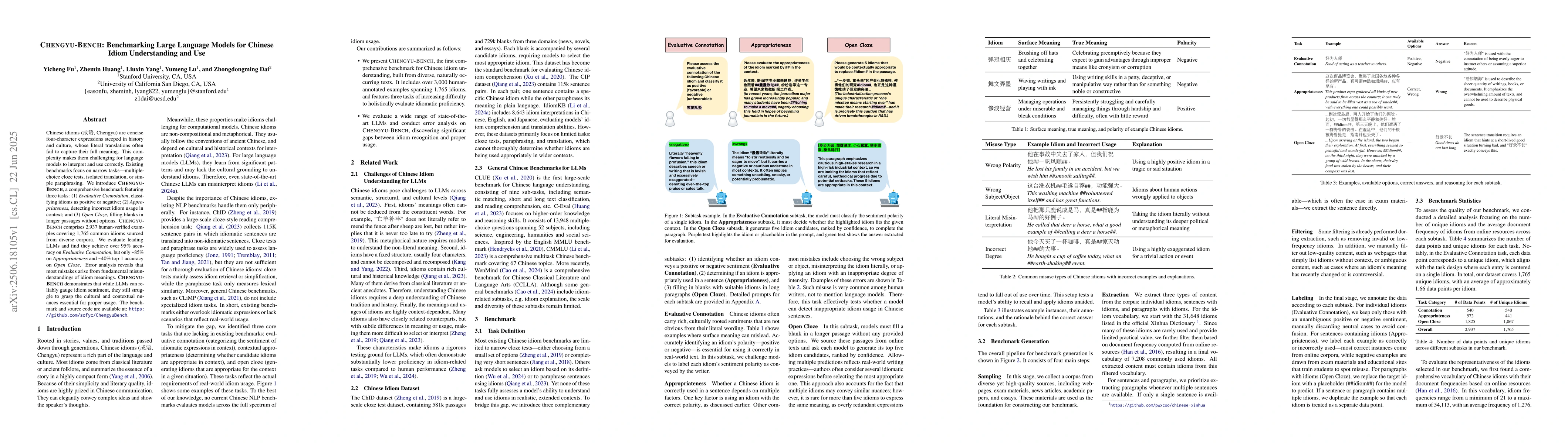 The research introduces Chengyu-Bench, a benchmark for evaluating large language models' understanding and use of Chinese idioms (Chengyu). It comprises three tasks: classifying idiom connotations, detecting incorrect usage, and completing open cloze tests. Despite high accuracy in sentiment classification, models struggle with contextual and cultural nuances, achieving lower scores in idiom appropriateness and open cloze tasks.
