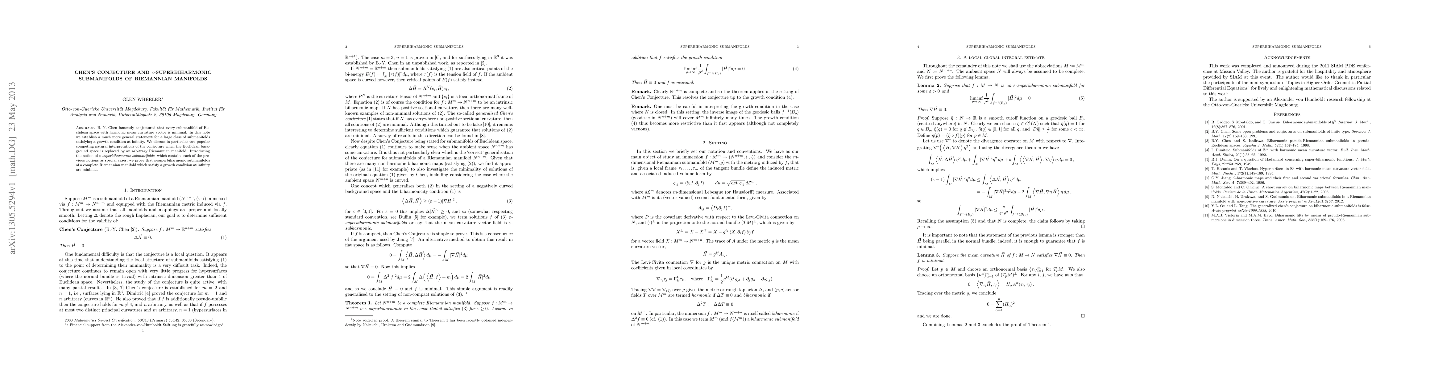 B.-Y. Chen famously conjectured that every submanifold of Euclidean space with harmonic mean curvature vector is minimal. In this note we establish a much more general statement for a large class of submanifolds satisfying a growth condition at infinity. We discuss in particular two popular competing natural interpretations of the conjecture when the Euclidean background space is replaced by an arbitrary Riemannian manifold. Introducing the notion of epsilon-superbiharmonic submanifolds, which contains each of the previous notions as special cases, we prove that epsilon-superbiharmonic submanifolds of a complete Riemannian manifold which satisfy a growth condition at infinity are minimal.