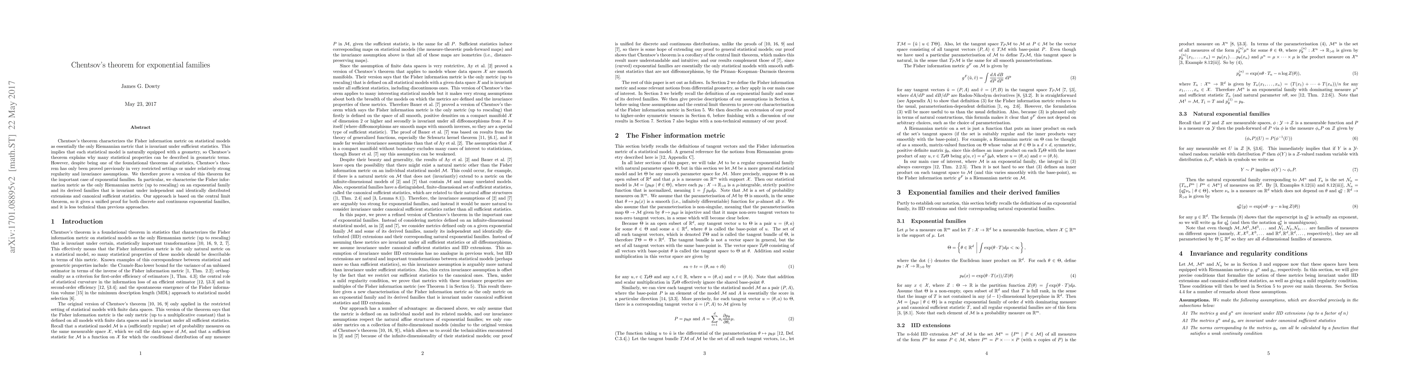 Chentsov's theorem characterizes the Fisher information metric on statistical models as essentially the only Riemannian metric that is invariant under sufficient statistics. This implies that each statistical model is naturally equipped with a geometry, so Chentsov's theorem explains why many statistical properties can be described in geometric terms. However, despite being one of the foundational theorems of statistics, Chentsov's theorem has only been proved previously in very restricted settings or under relatively strong regularity and invariance assumptions. We therefore prove a version of this theorem for the important case of exponential families. In particular, we characterise the Fisher information metric as the only Riemannian metric (up to rescaling) on an exponential family and its derived families that is invariant under independent and identically distributed extensions and canonical sufficient statistics. Our approach is based on the central limit theorem, so it gives a unified proof for both discrete and continuous exponential families, and it is less technical than previous approaches.