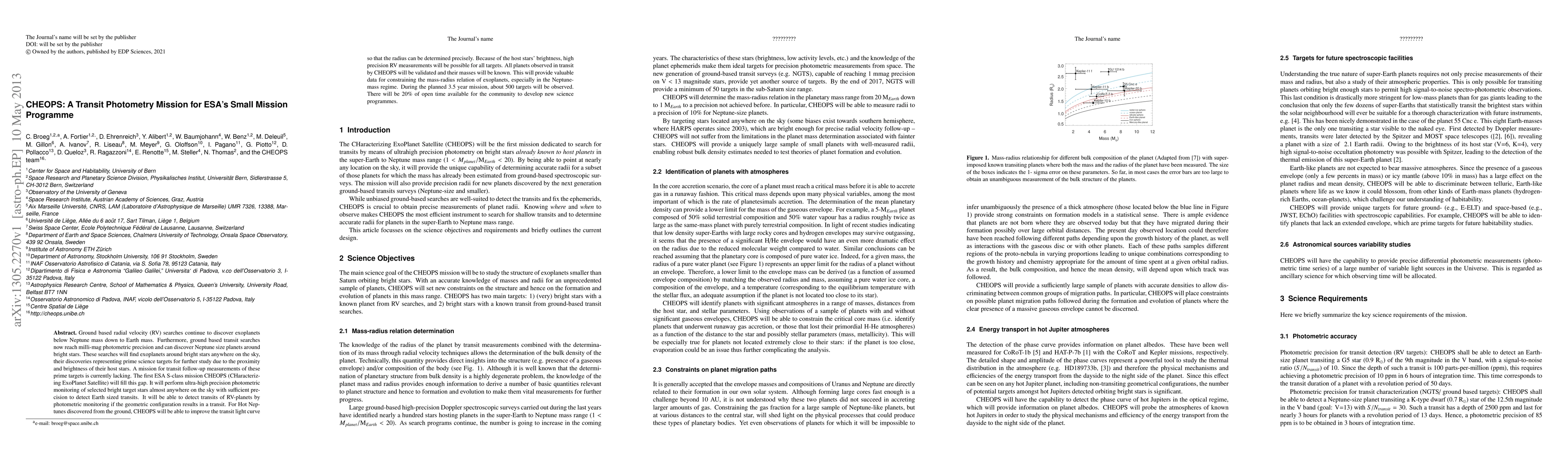 Ground based radial velocity (RV) searches continue to discover exoplanets below Neptune mass down to Earth mass. Furthermore, ground based transit searches now reach milli-mag photometric precision and can discover Neptune size planets around bright stars. These searches will find exoplanets around bright stars anywhere on the sky, their discoveries representing prime science targets for further study due to the proximity and brightness of their host stars. A mission for transit follow-up measurements of these prime targets is currently lacking. The first ESA S-class mission CHEOPS (CHaracterizing ExoPlanet Satellite) will fill this gap. It will perform ultra-high precision photometric monitoring of selected bright target stars almost anywhere on the sky with sufficient precision to detect Earth sized transits. It will be able to detect transits of RV-planets by photometric monitoring if the geometric configuration results in a transit. For Hot Neptunes discovered from the ground, CHEOPS will be able to improve the transit light curve so that the radius can be determined precisely. Because of the host stars' brightness, high precision RV measurements will be possible for all targets. All planets observed in transit by CHEOPS will be validated and their masses will be known. This will provide valuable data for constraining the mass-radius relation of exoplanets, especially in the Neptune-mass regime. During the planned 3.5 year mission, about 500 targets will be observed. There will be 20% of open time available for the community to develop new science programmes.