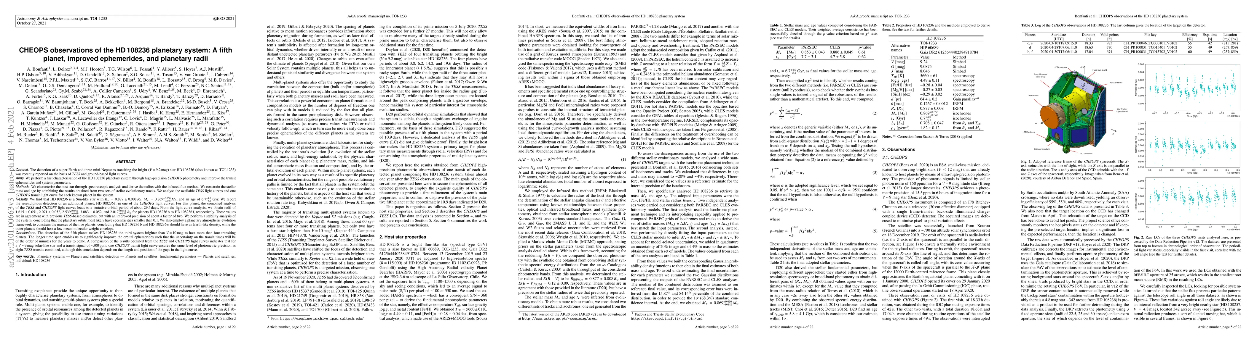 The CHEOPS observations of the HD 108236 system reveal a fifth planet, improve the transit ephemerides, and provide precise planetary radii. The study identifies HD 108236 f with radii of 2.017 $R_{\oplus}$ and confirms the system's stability with low orbital eccentricities.