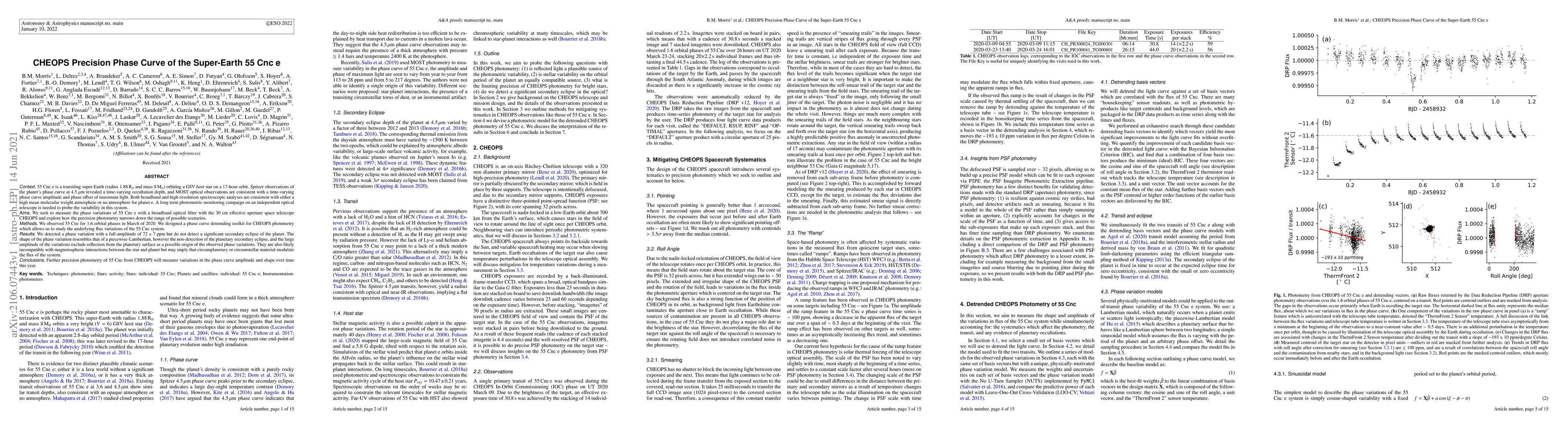 The CHEOPS telescope observed the super-Earth 55 Cnc e, detecting a 72 ppm phase variation but no significant secondary eclipse, suggesting the phase variations may be caused by circumplanetary or circumstellar material rather than planetary surface reflection. Further observations are needed to determine the long-term variability of the system.