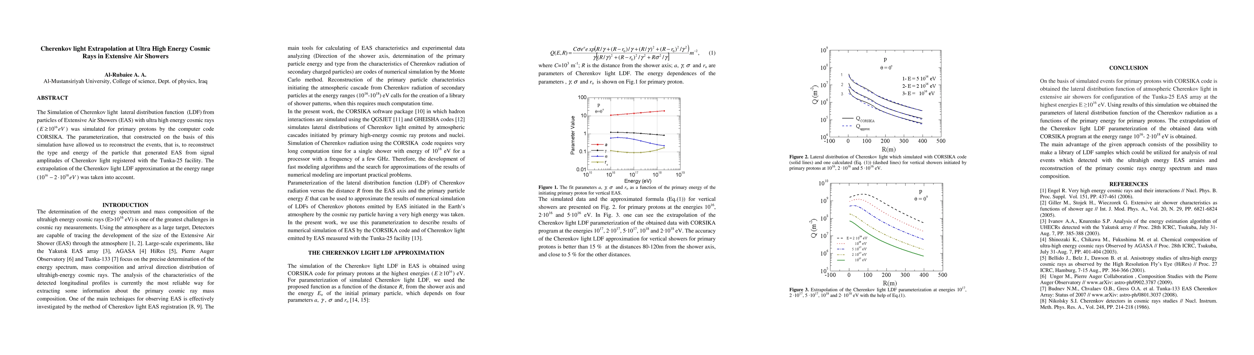 The research used a computer code CORSIKA to simulate the Cherenkov light lateral distribution function (LDF) from particles of Extensive Air Showers (EAS) with ultra high energy cosmic rays.