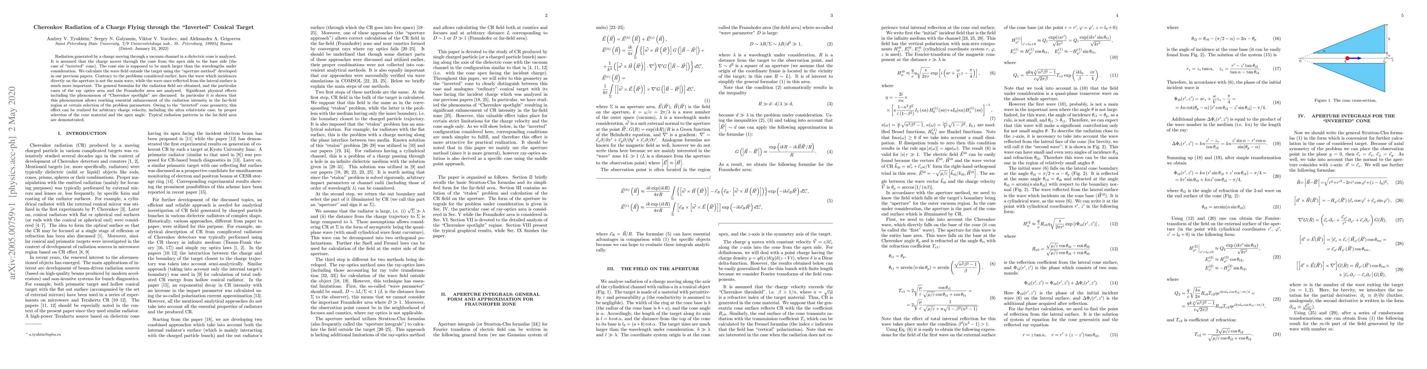 Radiation generated by a charge moving through a vacuum channel in a dielectric cone is analyzed. It is assumed that the charge moves through the cone from the apex side to the base side (the case of "inverted" cone). The cone size is supposed to be much larger than the wavelengths under consideration. We calculate the wave field outside the target using the "aperture method" developed in our previous papers. Contrary to the problems considered earlier, here the wave which incidences directly on the aperture is not the main wave, while the wave once reflected from the lateral surface is much more important. The general formulas for the radiation field are obtained, and the particular cases of the ray optics area and the Fraunhofer area are analyzed. Significant physical effects including the phenomenon of "Cherenkov spotlight" are discussed. In particular it is shown that this phenomenon allows reaching essential enhancement of the radiation intensity in the far-field region at certain selection of the problem parameters. Owing to the "inverted" cone geometry, this effect can be realized for arbitrary charge velocity, including the ultra relativistic case, by proper selection of the cone material and the apex angle. Typical radiation patterns in the far-field area are demonstrated.