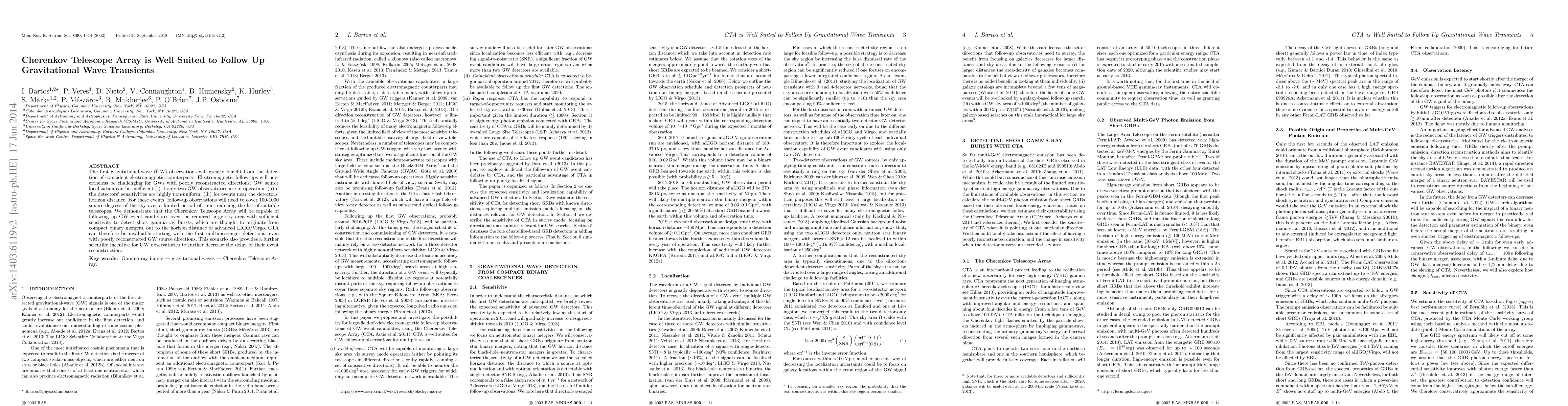 The Cherenkov Telescope Array (CTA) is well-suited to follow up gravitational wave (GW) transients, especially for poorly localized events, due to its capability to detect short gamma-ray bursts over large sky areas with sufficient sensitivity. CTA's effectiveness underscores the importance of improved GW event localization for multimessenger astronomy.