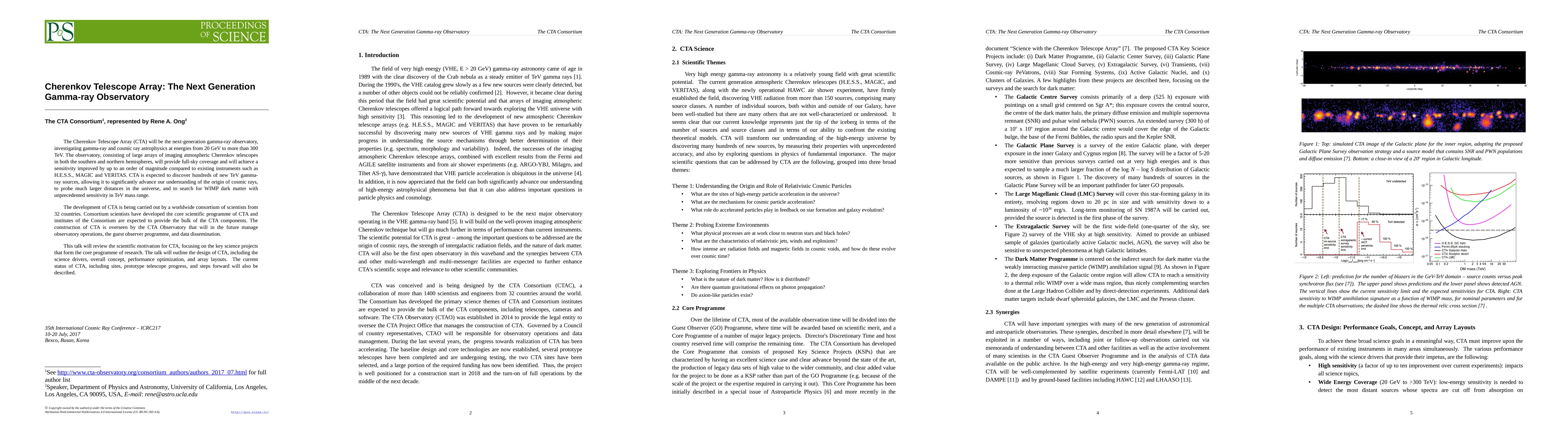 The Cherenkov Telescope Array (CTA) is designed to be the next-generation gamma-ray observatory, offering unprecedented sensitivity and full-sky coverage from 20 GeV to 300 TeV. CTA aims to significantly advance our understanding of cosmic rays, explore distant cosmic phenomena, and search for dark matter.
