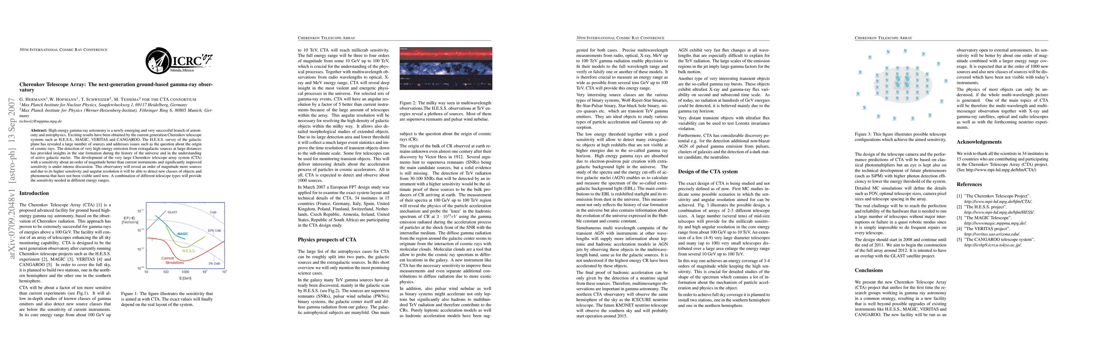 The research proposes the development of the Cherenkov Telescope Array (CTA), an advanced facility for ground-based high-energy gamma-ray astronomy, based on observing Cherenkov radiation. It aims to be more sensitive than current experiments by a factor of ten, covering a wide energy range from ~10 GeV to 100 TeV.