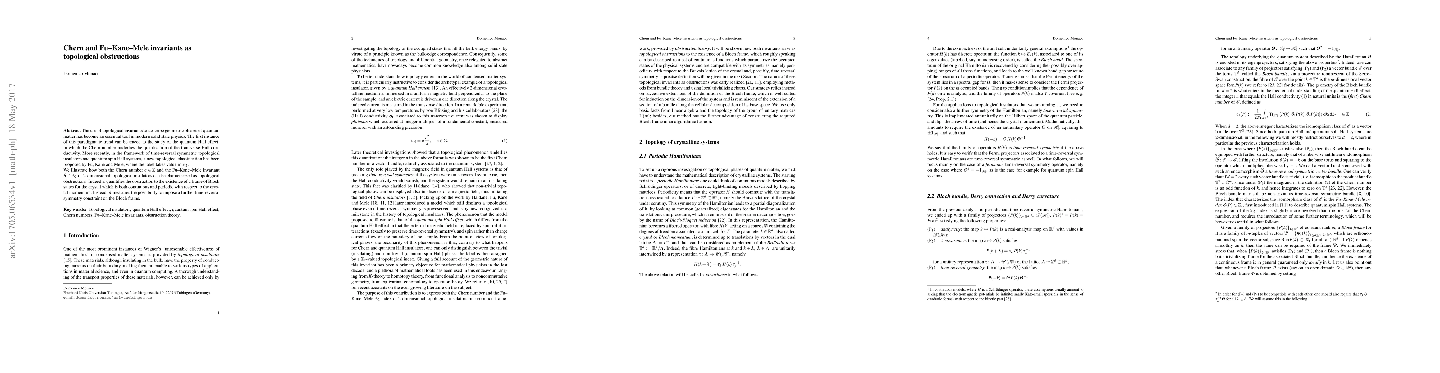 This paper discusses the Chern number and the Fu-Kane-Mele invariant as topological obstructions in quantum matter, illustrating their roles in classifying 2D topological insulators. The Chern number quantifies the obstruction to continuous, periodic Bloch states, while the Fu-Kane-Mele invariant measures the feasibility of time-reversal symmetry in such states.