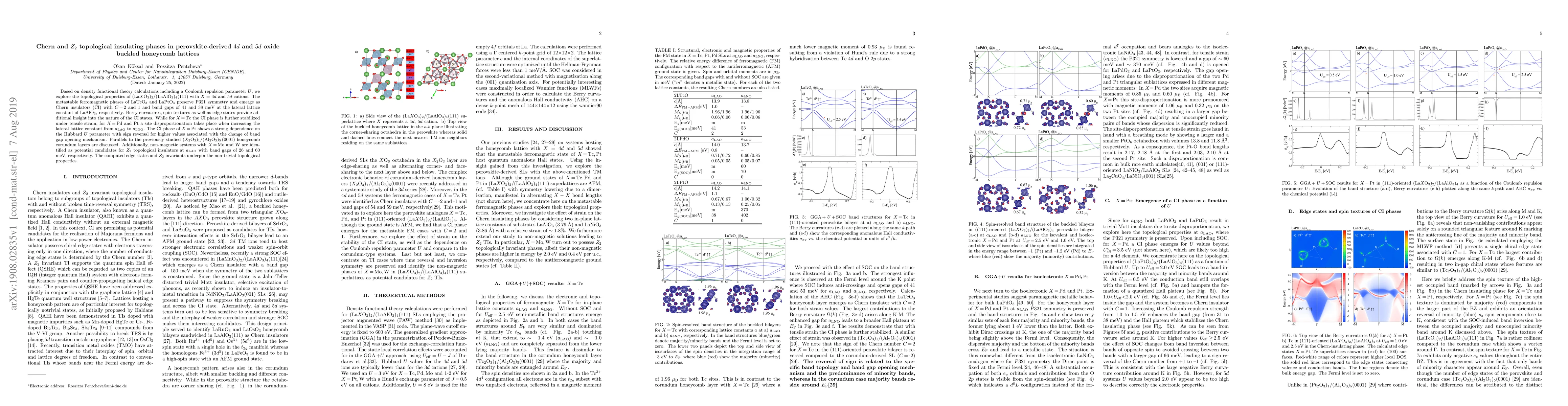 Based on density functional theory calculations including a Coulomb repulsion parameter $U$, we explore the topological properties of (La$X$O$_3$)$_2$/(LaAlO$_3$)$_4$(111) with $X=$ $4d$ and $5d$ cations. The metastable ferromagnetic phases of LaTcO$_3$ and LaPtO$_3$ preserve P321 symmetry and emerge as Chern insulators (CI) with $C$=2 and 1 and band gaps of 41 and 38 meV at the lateral lattice constant of LaAlO$_3$, respectively. Berry curvatures, spin textures as well as edge states provide additional insight into the nature of the CI states. While for $X$=Tc the CI phase is further stabilized under tensile strain, for $X$=Pd and Pt a site disproportionation takes place when increasing the lateral lattice constant from $a_{\rm LAO}$ to $a_{\rm LNO}$. The CI phase of $X$=Pt shows a strong dependence on the Hubbard $U$ parameter with sign reversal for higher values associated with the change of band gap opening mechanism. Parallels to the previously studied ($X_2$O$_3$)$_1$/(Al$_2$O$_3$)$_5$(0001) honeycomb corundum layers are discussed. Additionally, non-magnetic systems with $X$=Mo and W are identified as potential candidates for $Z_2$ topological insulators at $a_{\rm LAO}$ with band gaps of 26 and 60 meV, respectively. The computed edge states and $Z_{2}$ invariants underpin the non-trivial topological properties.
