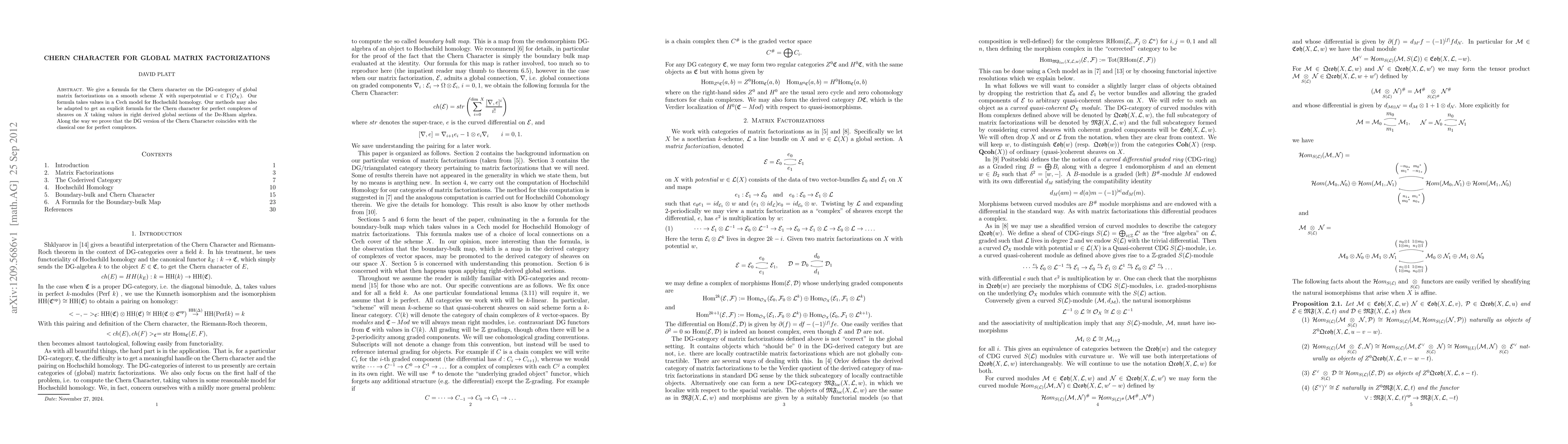 This paper presents a formula for the Chern character within the DG-category of global matrix factorizations on a smooth scheme, showing it aligns with the classical Chern character for perfect complexes. The results also extend to provide an explicit Chern character for perfect complexes of sheaves in terms of derived global sections of the De-Rham algebra.