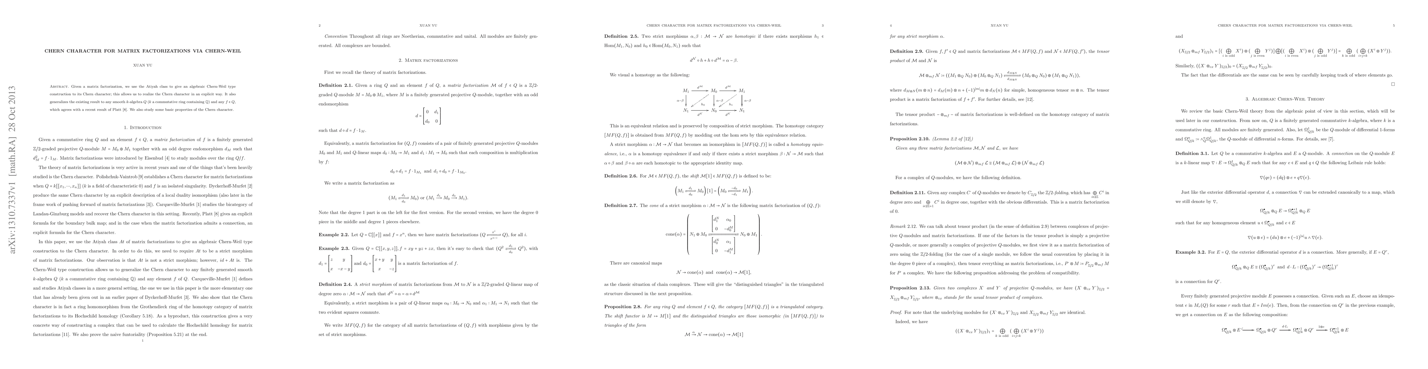This paper introduces an algebraic Chern-Weil construction for matrix factorizations using the Atiyah class, allowing explicit realization of their Chern character and generalizing results to smooth $k$-algebras. It also aligns with recent findings by Platt and explores fundamental properties of the derived Chern character.