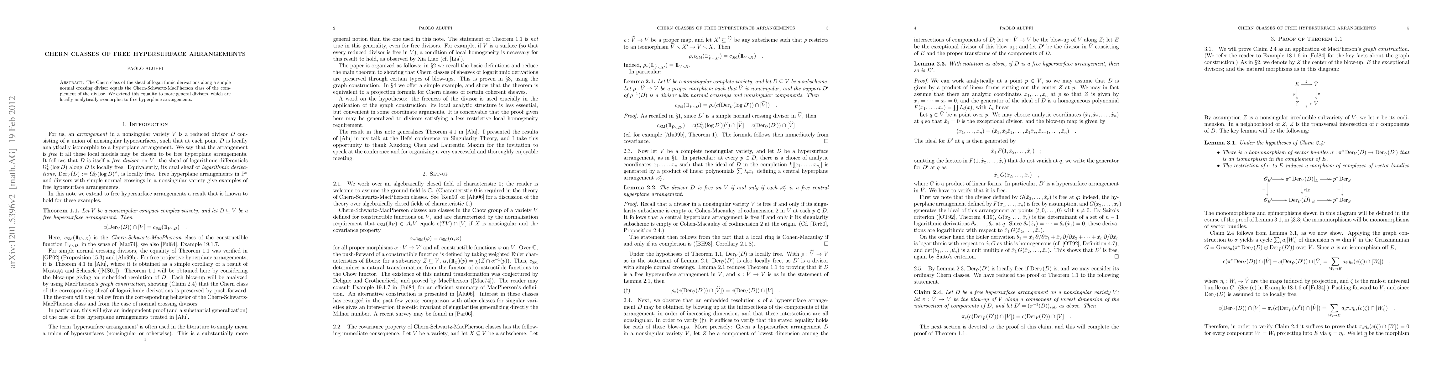 Summary: This paper establishes an equality between the Chern class of the sheaf of logarithmic derivations along a simple normal crossing divisor and the Chern-Schwartz-MacPherson class of the complement, extending this relationship to more general free hypersurface arrangements.