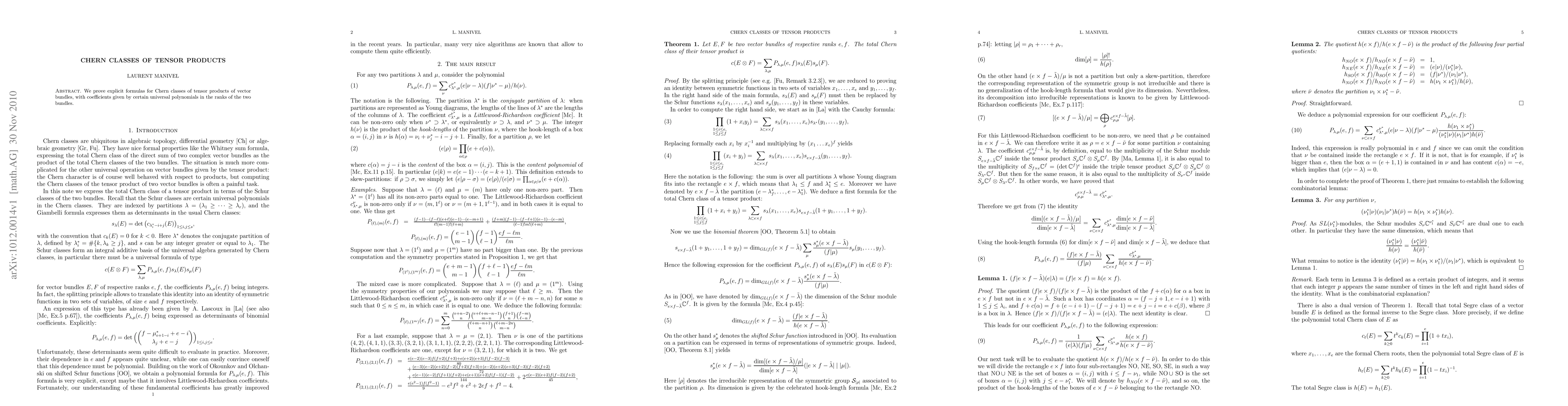 Summary: This paper derives explicit formulas for Chern classes of tensor products of vector bundles, utilizing universal polynomials based on the bundles' ranks. The results provide a deeper understanding of the relationship between the Chern classes of individual bundles and their tensor product.