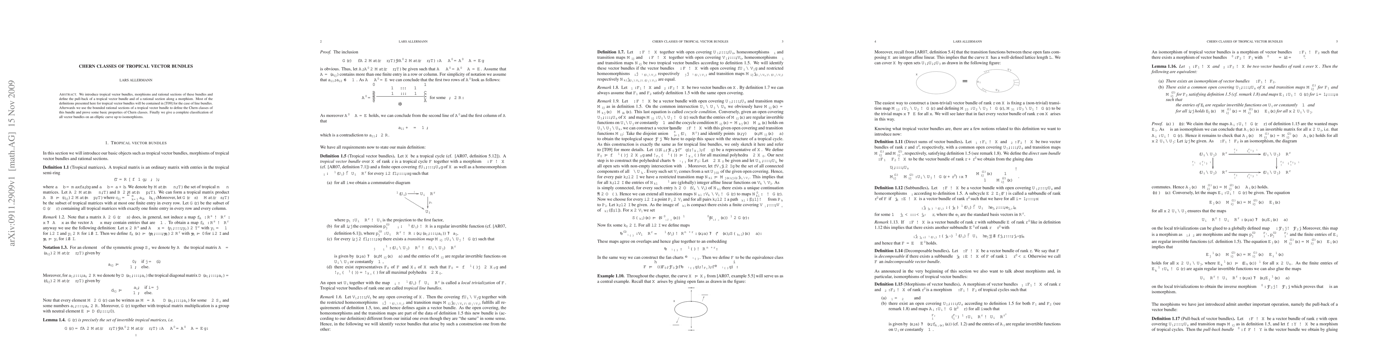This paper introduces tropical vector bundles and their morphisms, defining pull-backs and rational sections. It establishes Chern classes for these bundles using bounded rational sections and proves foundational properties, culminating in a classification of vector bundles on elliptic curves.